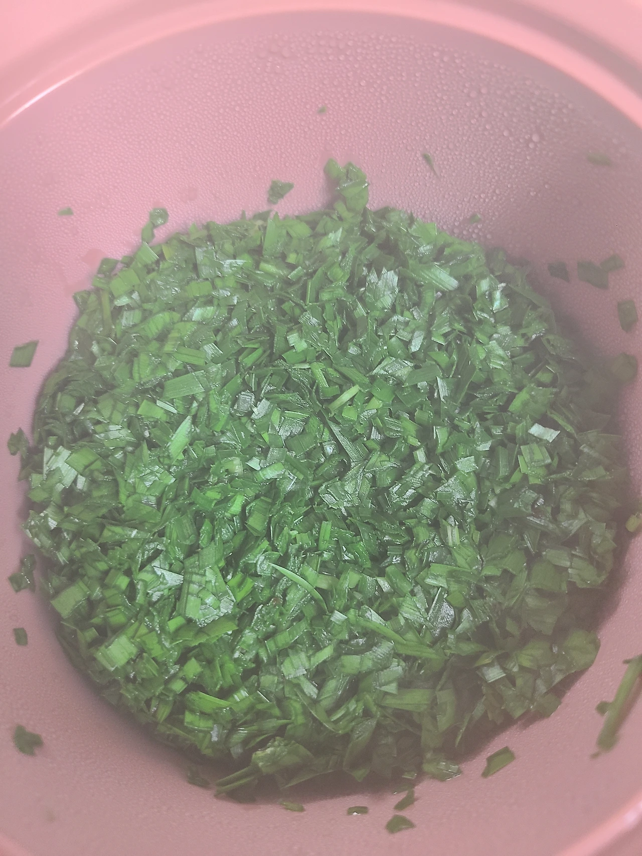 3) 찜기에 다진 부추를 넣고 전자렌지 약 3분 돌린다.