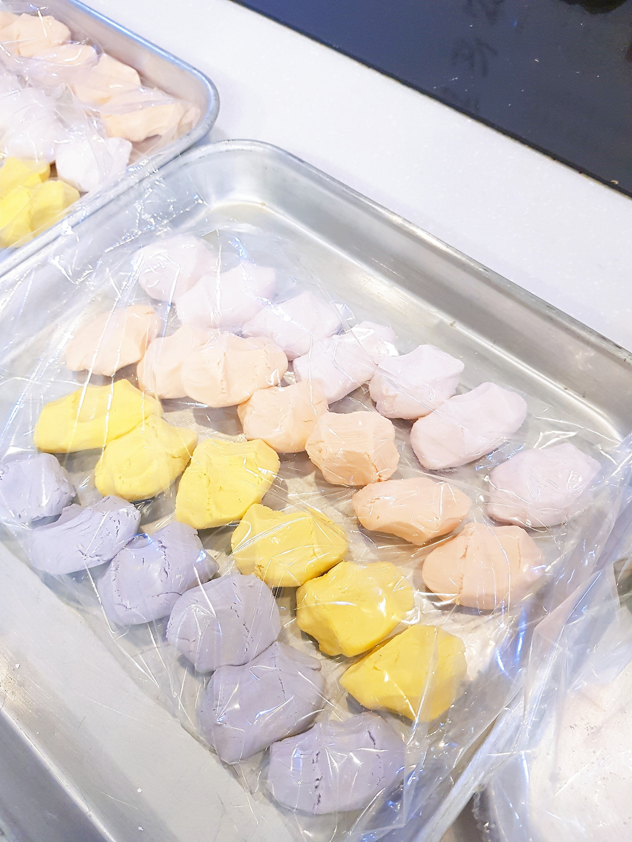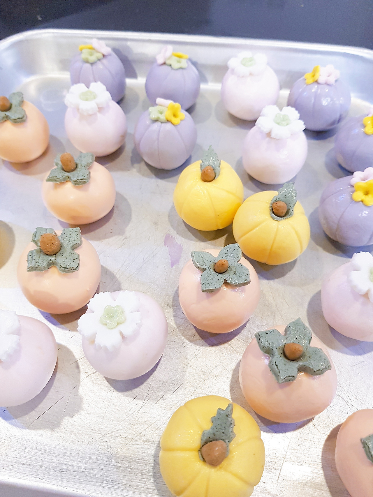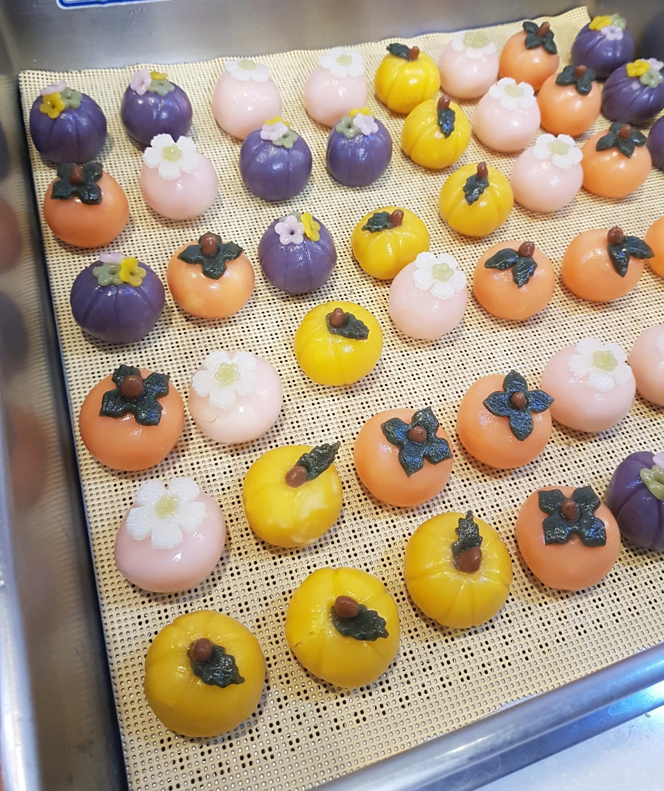 동그랗게 얼린 녹두소는 고소하고 달달한 사탕 같고, 송편의 떡 반죽은 단호박, 자색고구마 등으로 색색깔로 준비해 준다. 녹두소를 넣어 빚은 송편은, 모양틀의 도움을 조금 더 받아서 감도 되고 호박도 되고 벚꽃같아 보이게도 된다. 완성한 송편을 찜틀에 15분 정도 찌면 색깔이 더욱 진하게 나와서 서양식 제과를 뺨칠 정도다. 이게 정말 보는 사람을 뿌듯하게 한다. 이 과정에서 손재주가 필요한 부분은 녹두소를 넣어 동그랗게 빚는 단계뿐이다.