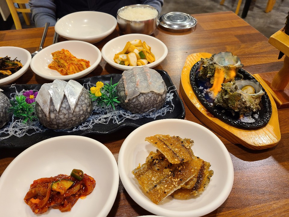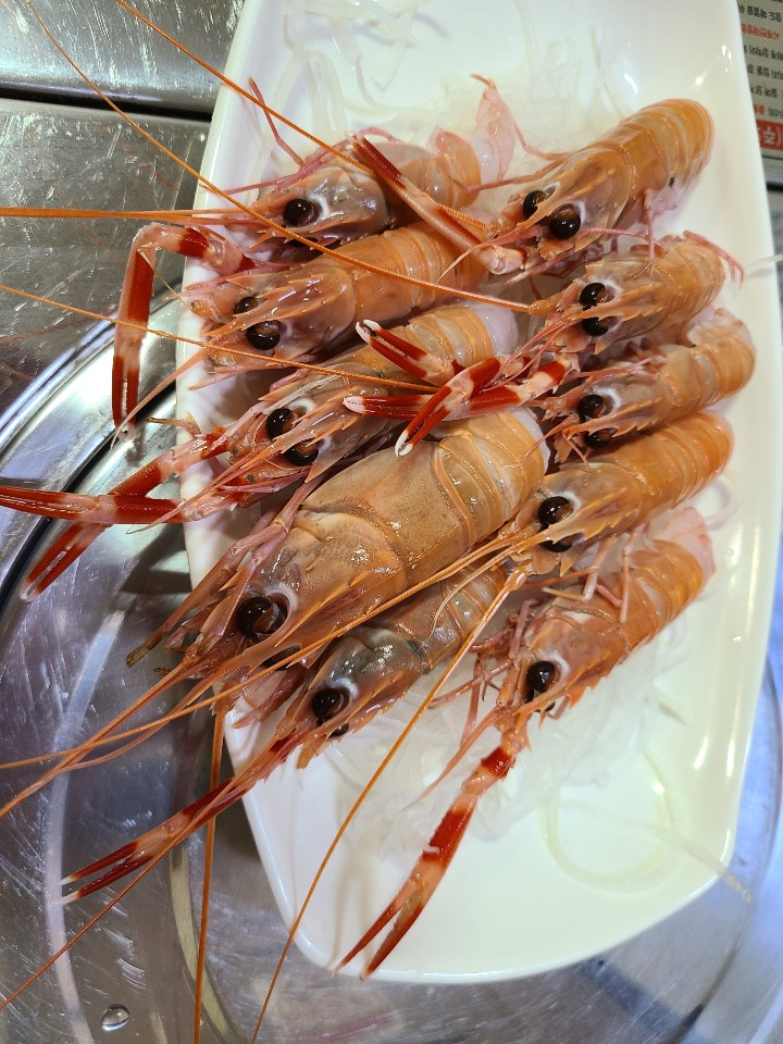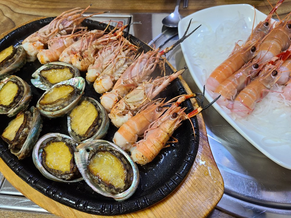 우도에 다녀와서, 매일올레시장에서 딱새우회와 전복버터구이를 먹었다.