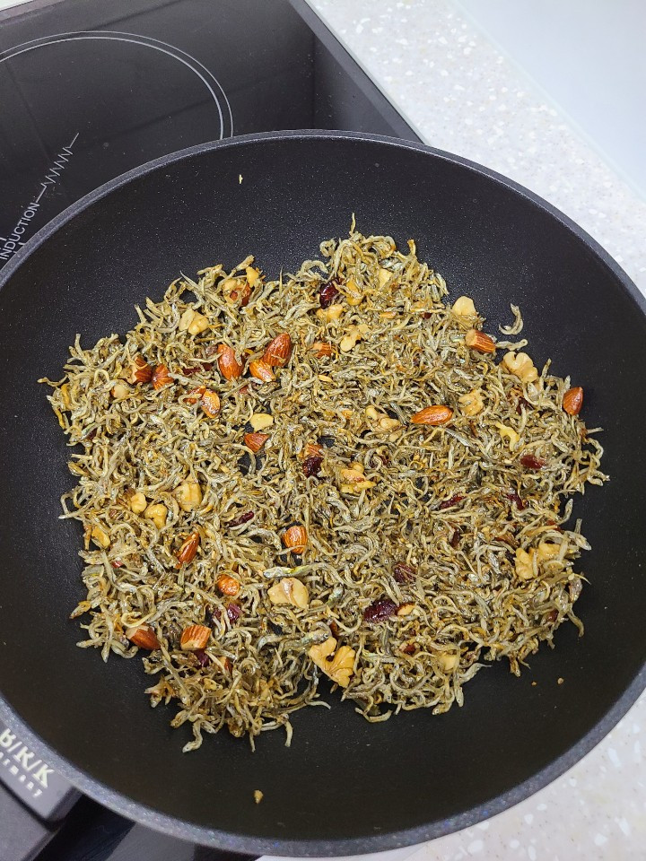회사 답례품 돌리고 남은 견과와, 엄마가 사 준 볶음용 멸치를 넣어 멸치볶음을 했다.