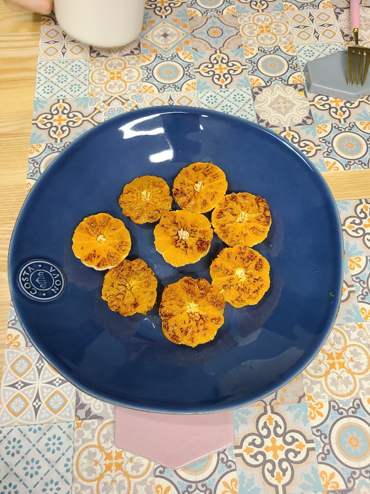 아침으로 귤을 구워 먹었다. 제주도에서 본 건데 단맛이 더 강해지고 일단 차갑지 않아서 좋다.