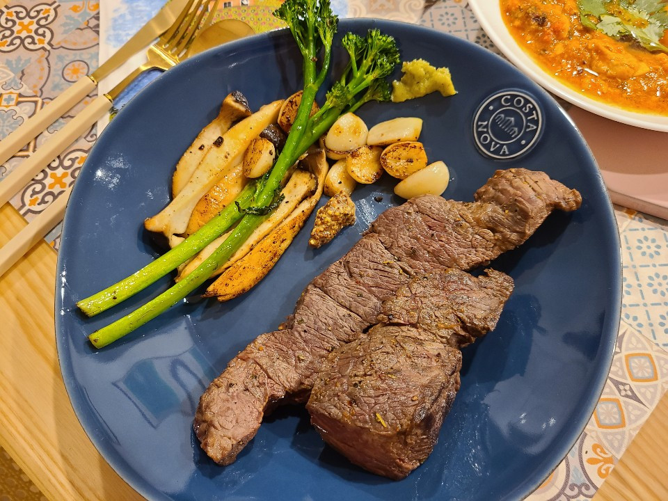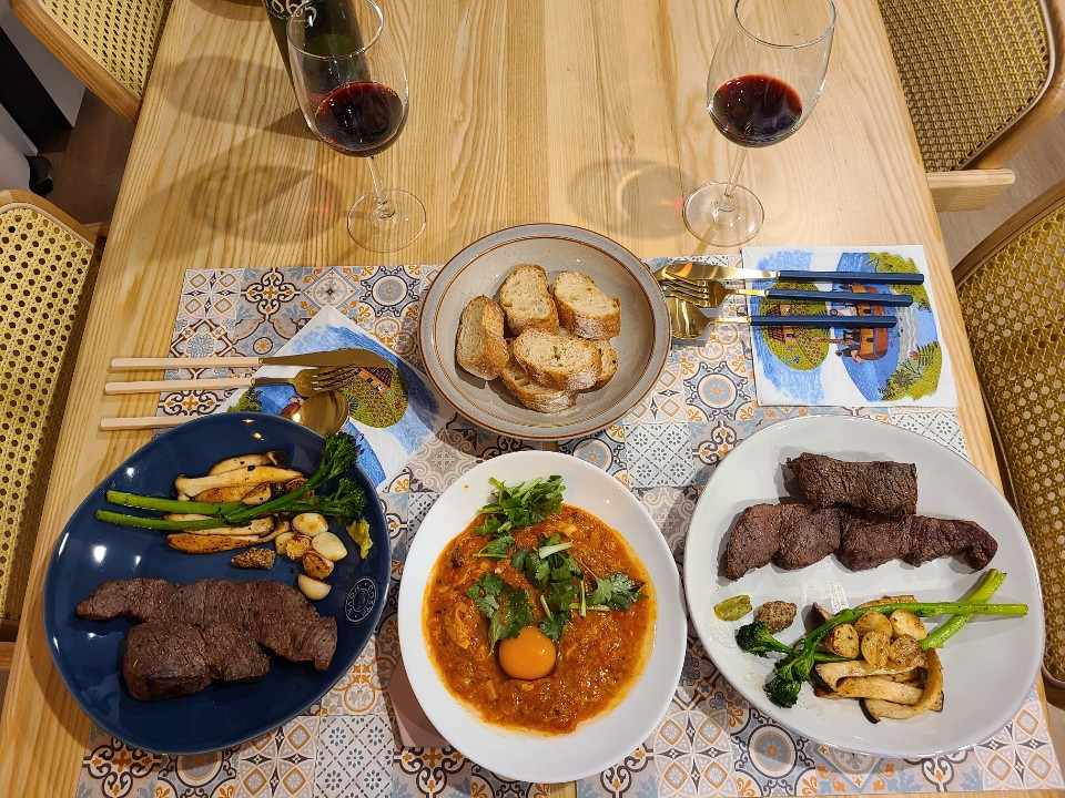 에그인헬 - 흰자가 안 익어서 그렇지 에그인헬 맞다...- 과 구운 브로콜리니, 새송이버섯, 마늘을 곁들인 살치살 스테이크. 왜 아스파라거스와 양송이버섯이 아니냐고 묻는다면 코로나 크리스마스에는 모두가 비슷한 생각 - 근사한 레스토랑에 가긴 글렀으니 마트에서 재료사다 스테이크라도 구워 먹어야겠다 - 을 한다는 것을 알았더라면 더 좋았을 거다, 라고 답하겠다.