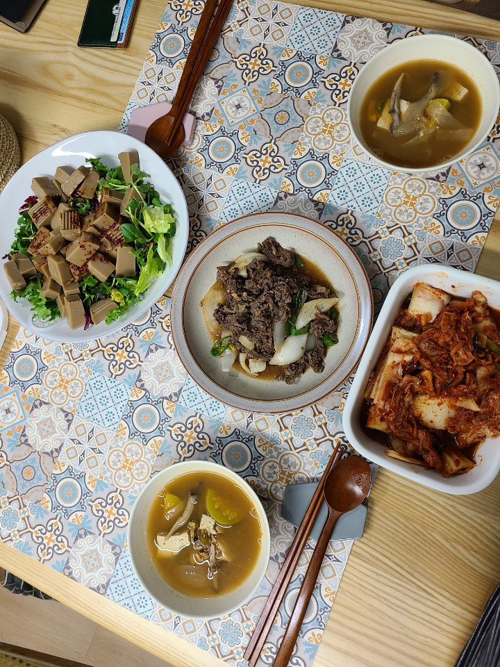 얼려 둔 소불고기와 새 김장김치, 도토리묵무침으로 저녁.