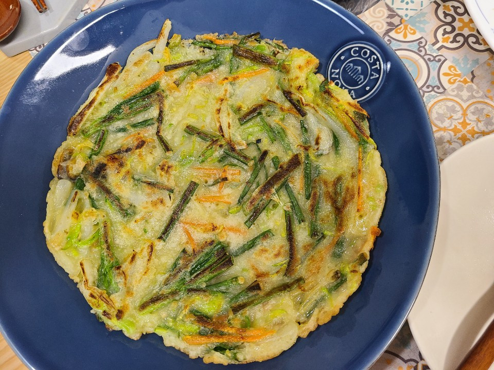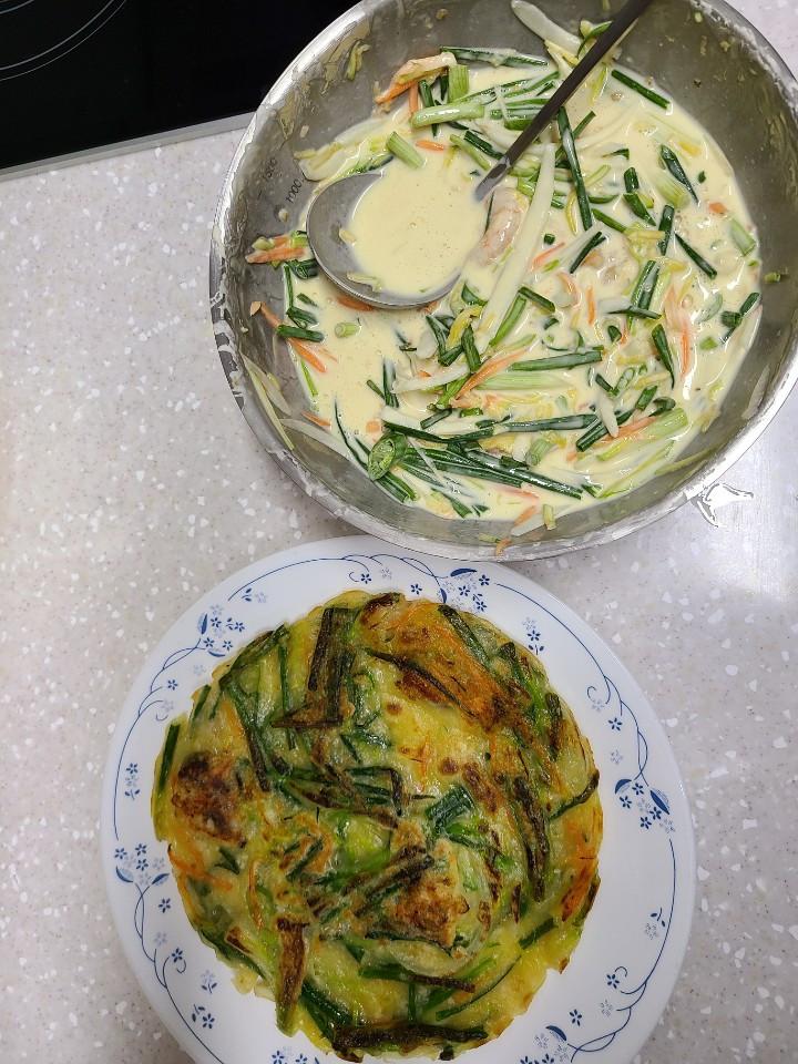 점심에는 또 역시 해동한 제육볶음을 구워서 먹었고, 저녁에는 틈내서 다듬어 둔 쪽파, 당근, 양파, 애호박, 그리고 해물모듬을 넣어 해물파전을 둘이 부쳐 먹었다. 반죽이 어렵다. 부침가루와 튀김가루가 1:1이라는데 재료가 넘쳐나서인지 계속 추가해도 반죽이 부족하다. 부침개나 파전 류를 별로 나는 안 좋아하는데, J가 좋아한다니까 한번 시도해 봤다. 근데 그 와중에 해물 넣은 건 덜 선호한단다. 내 기준에서는 더 넣었어야 하거든!