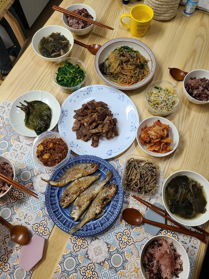 아침에 극구 짧게 다녀가신 시부모님이 주신 반찬으로 이렇게나 푸짐한 점심이 차려졌다. 사진에서 내가 한 게 굴비 말고 하나도 없다. 점심때 오신 우리 부모님이 괜한 이득...?