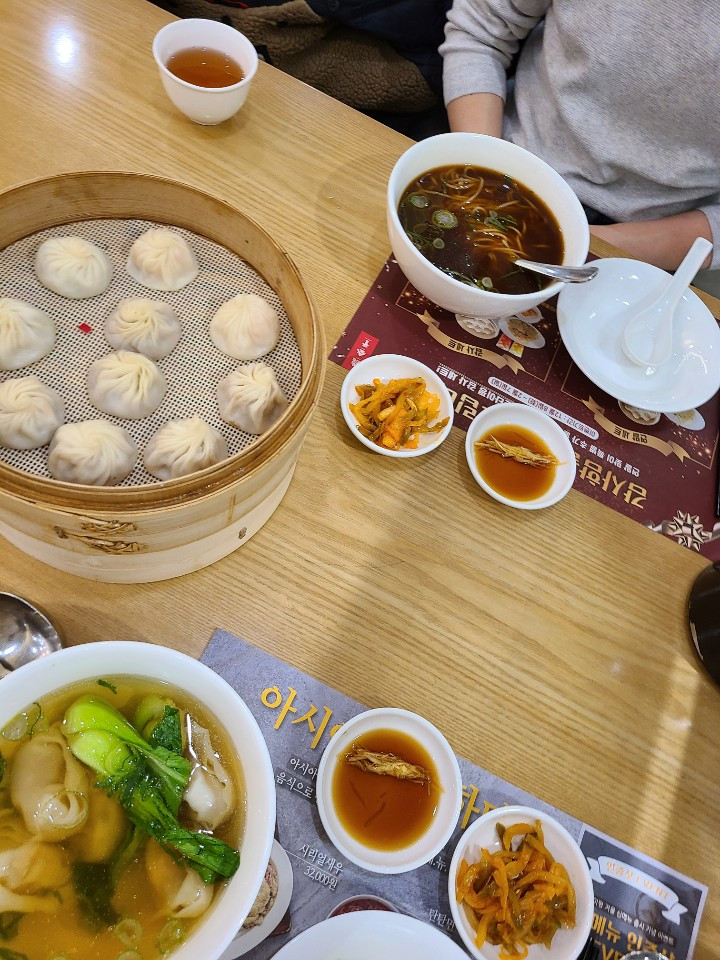 딘타이펑에서 샤오롱바오 샘플러, 우육탕면, 새우완탕 주문. 새우완탕 너무 맛있다.