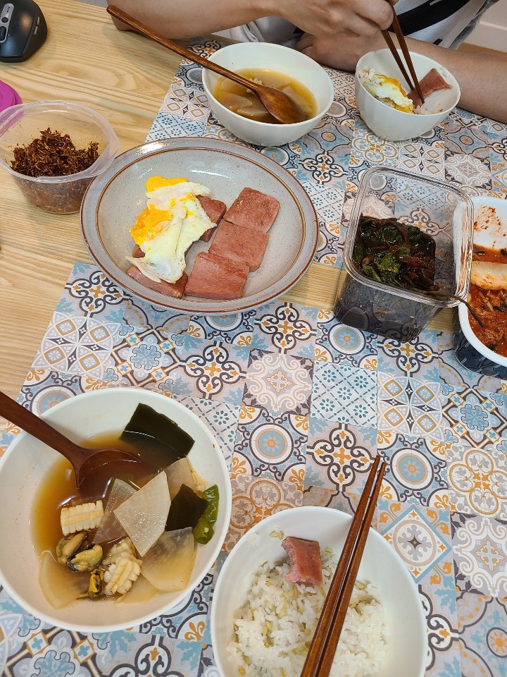 생일 선물로 지인에게 받은 르크루제 식기 세트. 스타 릴리프 라고 하는 시리즈인가 보다. 르크루제는 묘하게 내 돈 주고 사기 아까웠는데, 따뜻한 양식 요리를 담으면 예쁘겠다. 나만 휴가, J는 재택이었던 날, 로스X과 달걀후라이를 하고, 무와 냉동 해물을 넣어 시원하게 한그릇. 오징어무국을 하고 싶었던 건데, 생물 오징어는 안 사게 돼.