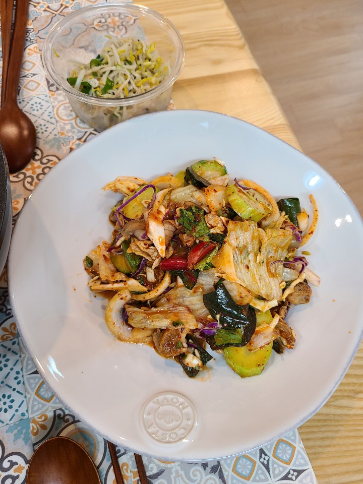 출근. 샐러드 야채와 오이,양파를 골뱅이에 무쳤다. 양도 많고 맛도 그럴듯한데 이게 이렇게 쉬운 요리였다니.