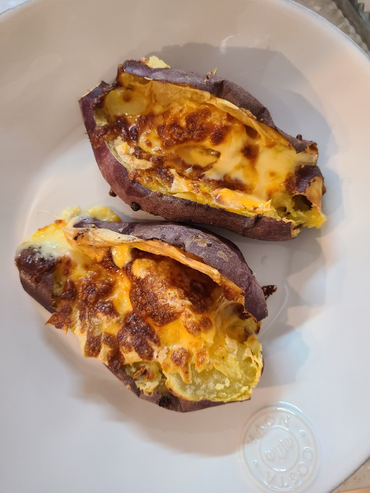 야식으로는 고구마가 아직 네 개 정도 남아서, 그 중 크기가 비슷한 두 개를 버터, 체다치즈, 피자치즈를 얹어서 구웠다. 비주얼은 좀 지옥에서 돌아온 것 같지만 정말 맛있었다. 스뎅 찜틀을 어떻게 고정하는지 몰라서 고구마 찌기를 1차 실패하고 에어프라이어에 넣어서 그냥 익혔다. 에어프라이어 만세. 난 밤고구마파.