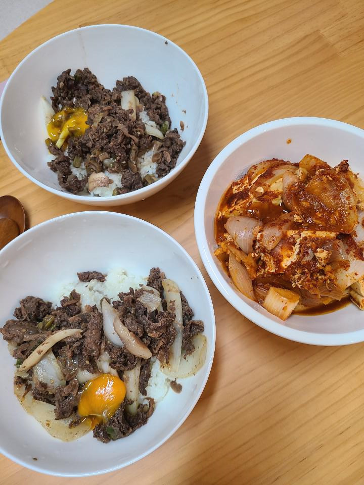 소불고기와 달걀 노른자를 얹어서 나름 규동을 저녁으로, 비주얼이 또 영 그렇지만...