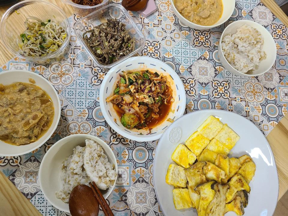 저녁으로 남은 골뱅이무침과 콩비지. 새송이버섯과 두부를 달걀에 부쳤다.