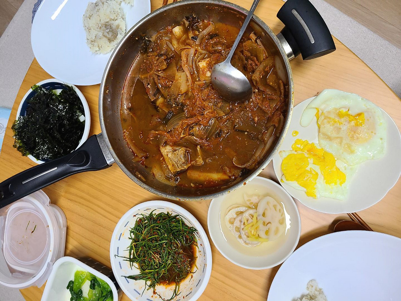 저녁으로는 어제 남은 김치찜을 약간 새마을식당 7분김치찌개 느낌으로다 비벼 먹었다.