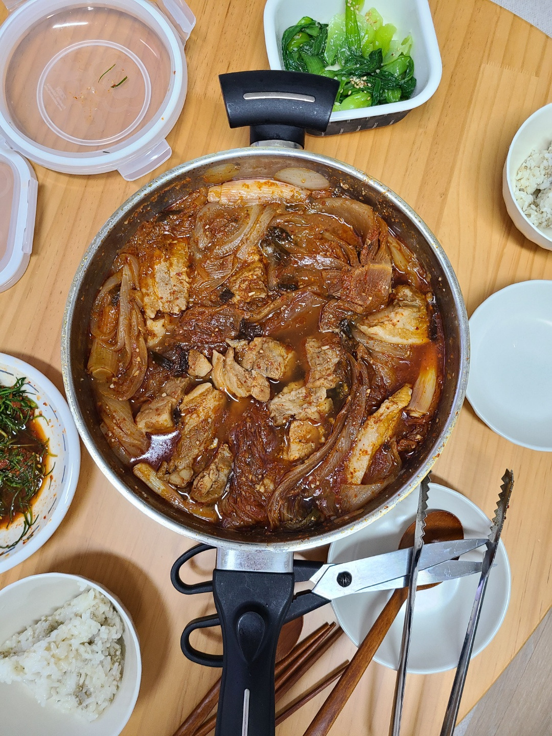 J의 퇴근 시간에 대략 맞춰서 돼지고기김치찜을 했다. J가 예상보다 늦어졌지만 그만큼 깊고 맛있는 김치찜을 맛볼 수 있었다. 김치찜은 푹, 한시간 이상 쪄야 하는 구나. 이래야 식당 맛이 나오는구나.