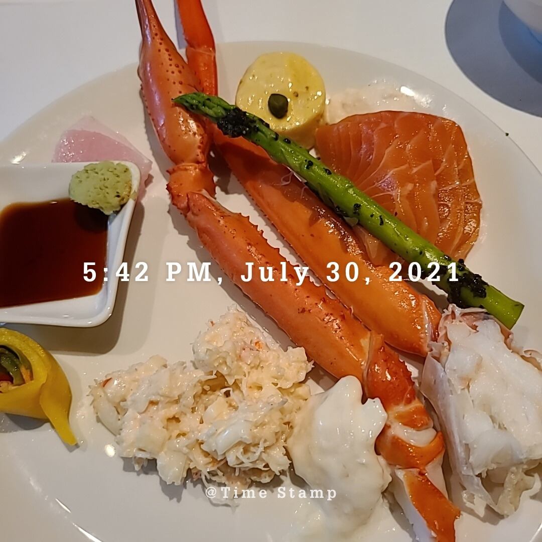 첫 접시는 생선과 해산물 위주로, 대게, 연어, 관자, 게살 샐러드 등등.