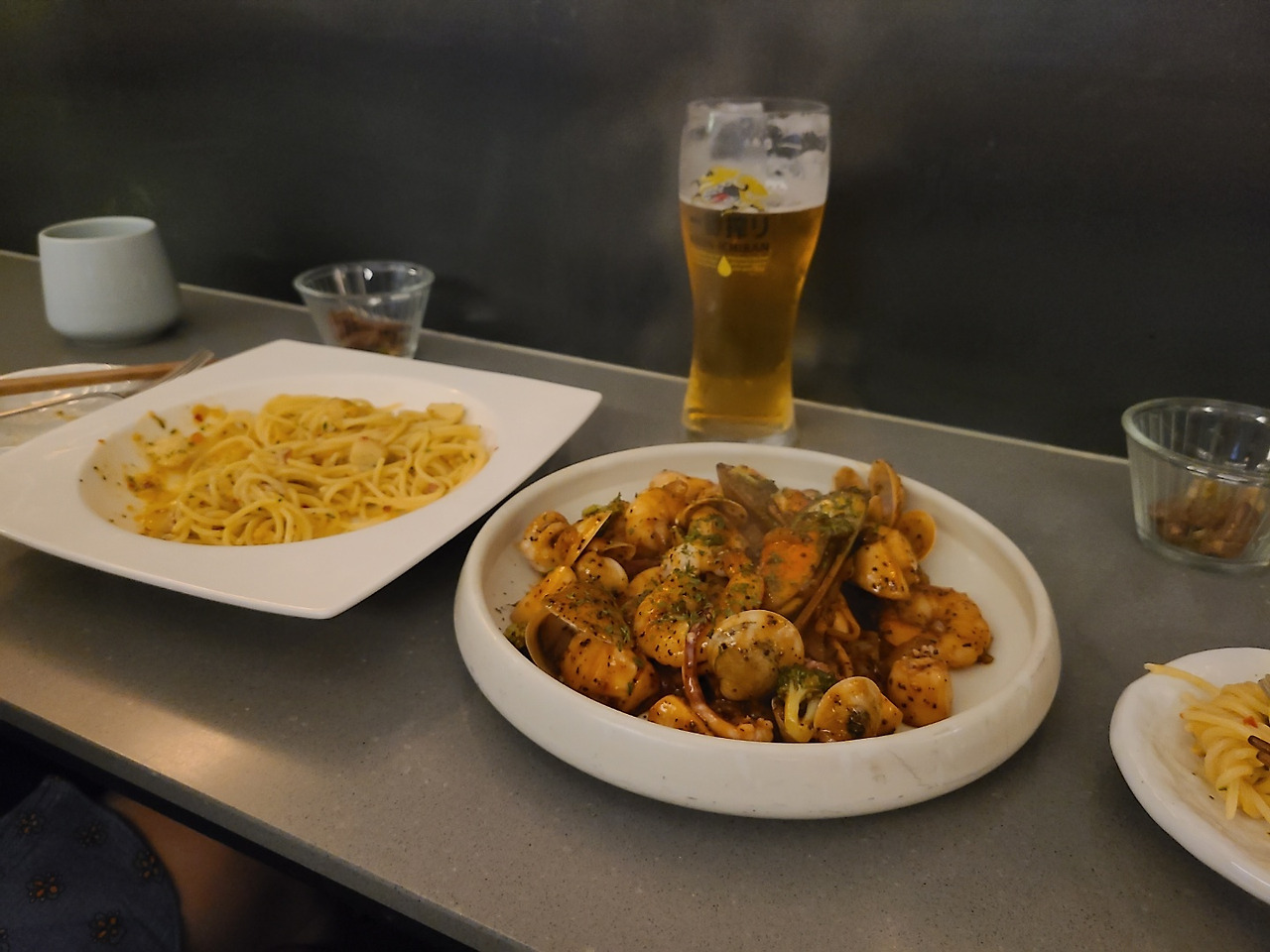 파스타 먹고 싶다고 노래를 불렀던지라 우니어란 파스타를 고르고, 블랙페퍼 카이센 볶음과 에비스 생맥주 한 잔. 둘다 맛있다 :)