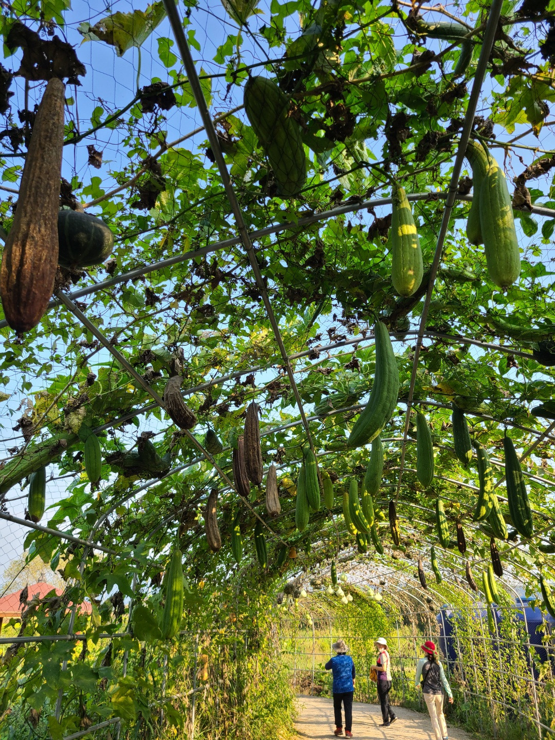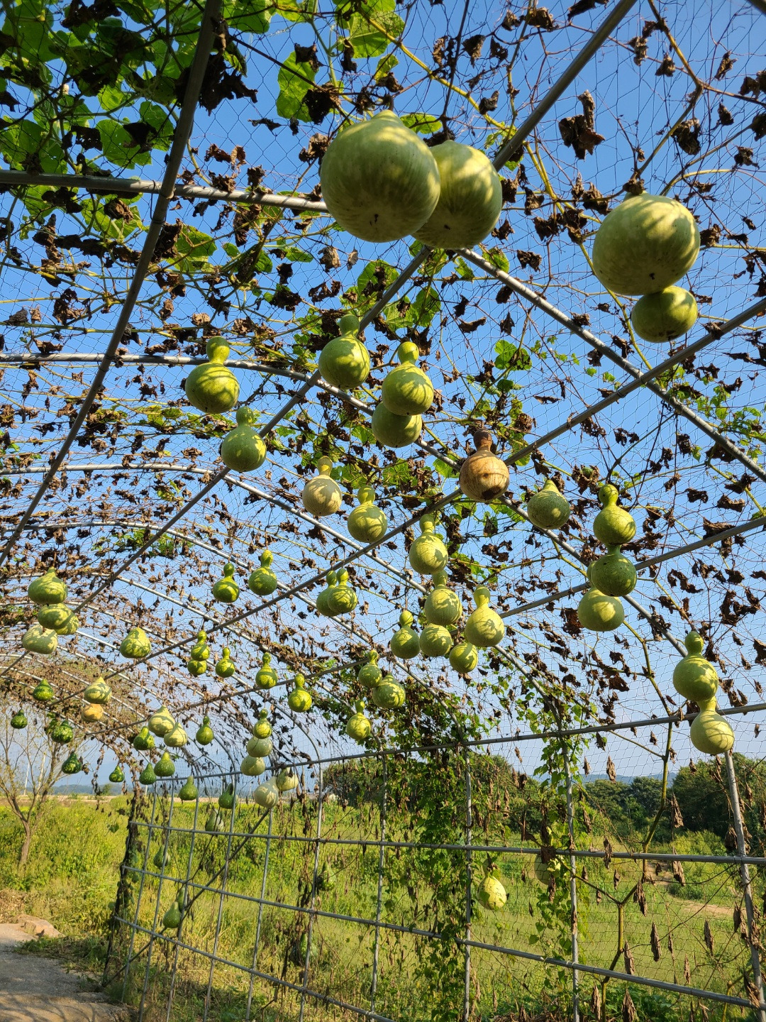 어느 분의 사유지일 지는 모르겠지만, 주렁주렁 달려 있는 수세미와 호박들을 보면서