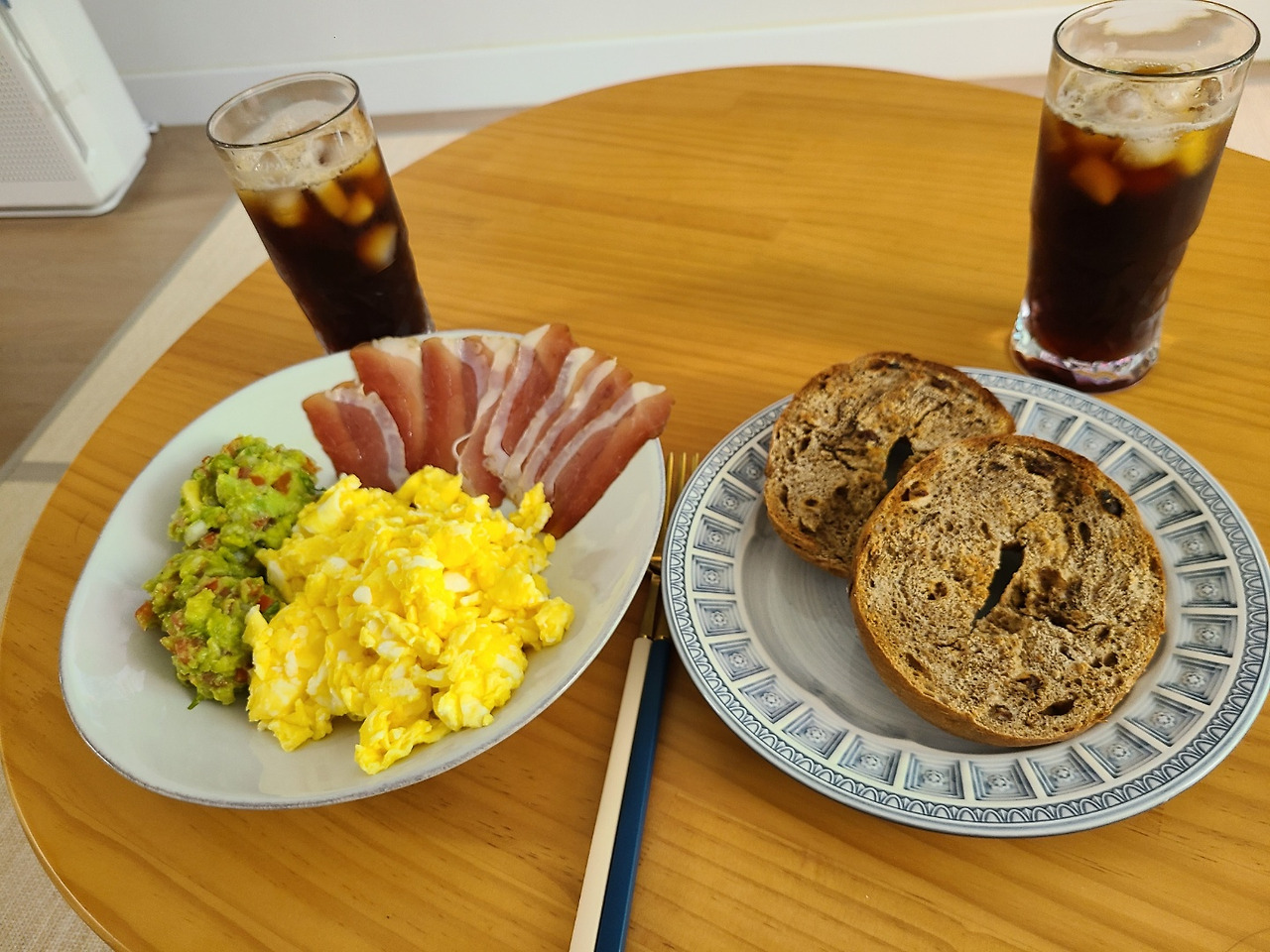 마지막 냉동 베이글을 털고, 달걀로 스크램블 에그를 만들고, 냉동 아보카도와 토마토, 양파, 바질을 썰어서 과카몰레를 만들고, 하니 되게 그럴듯한 브런치 식탁이 완성됐다.