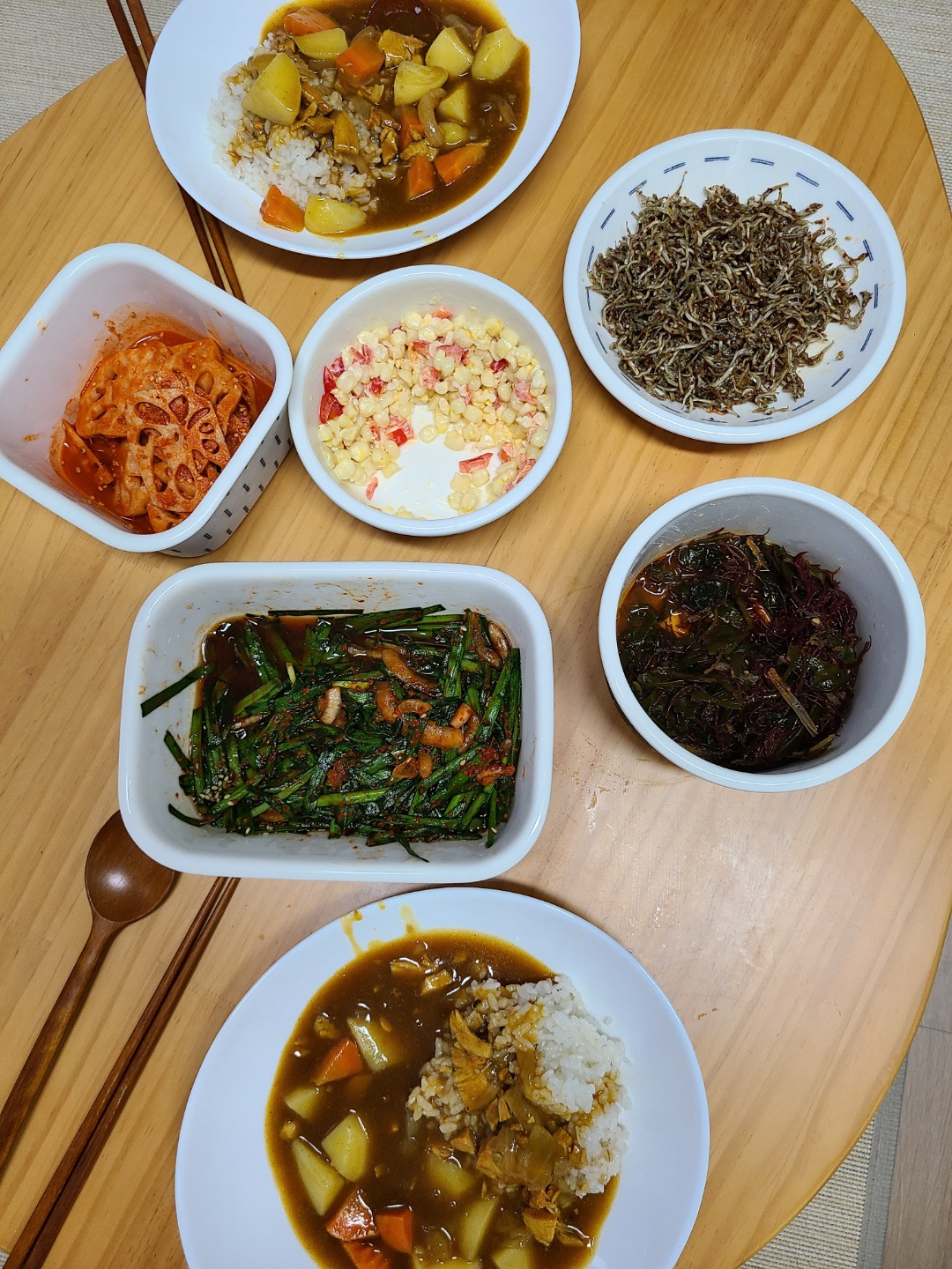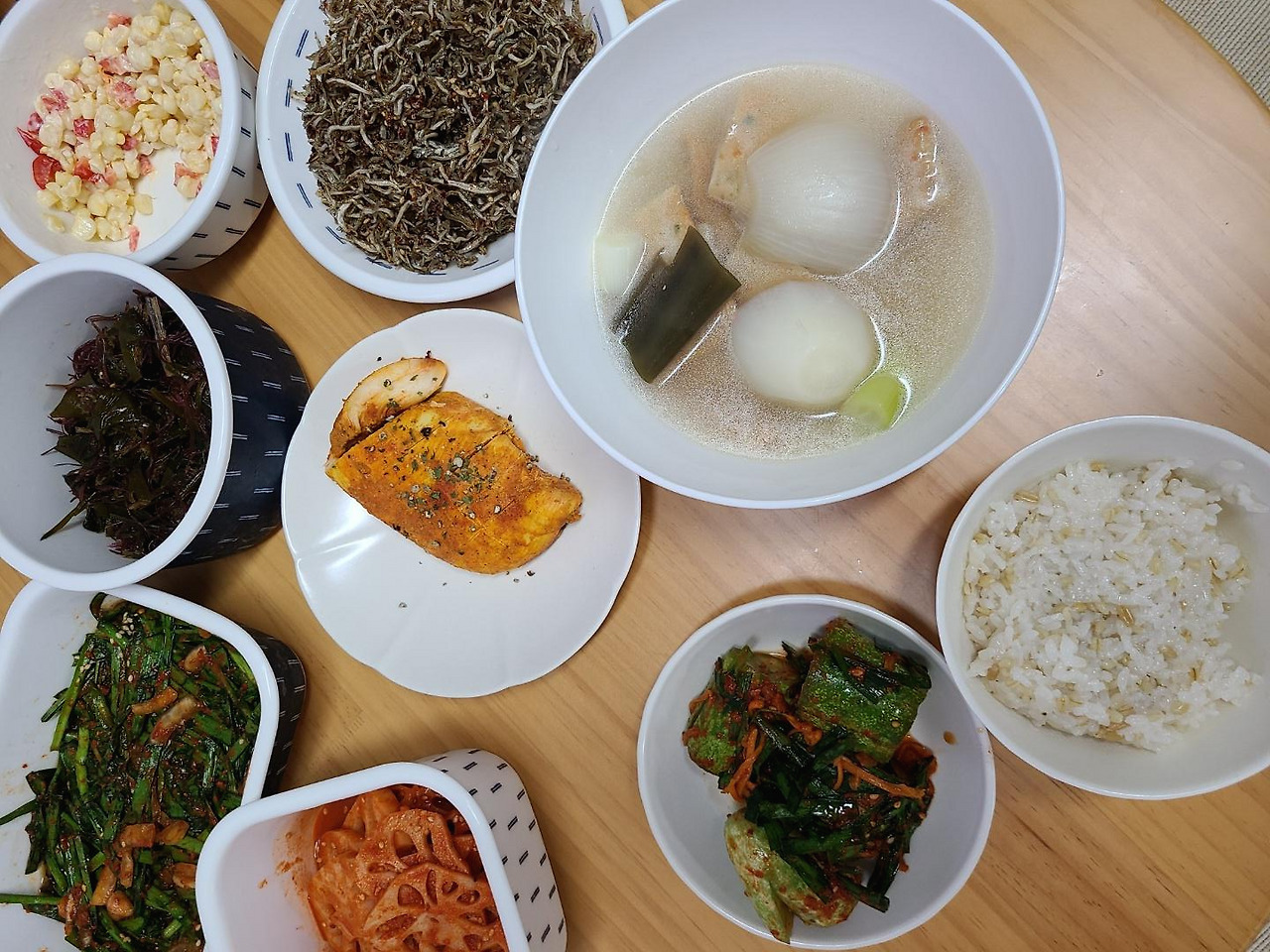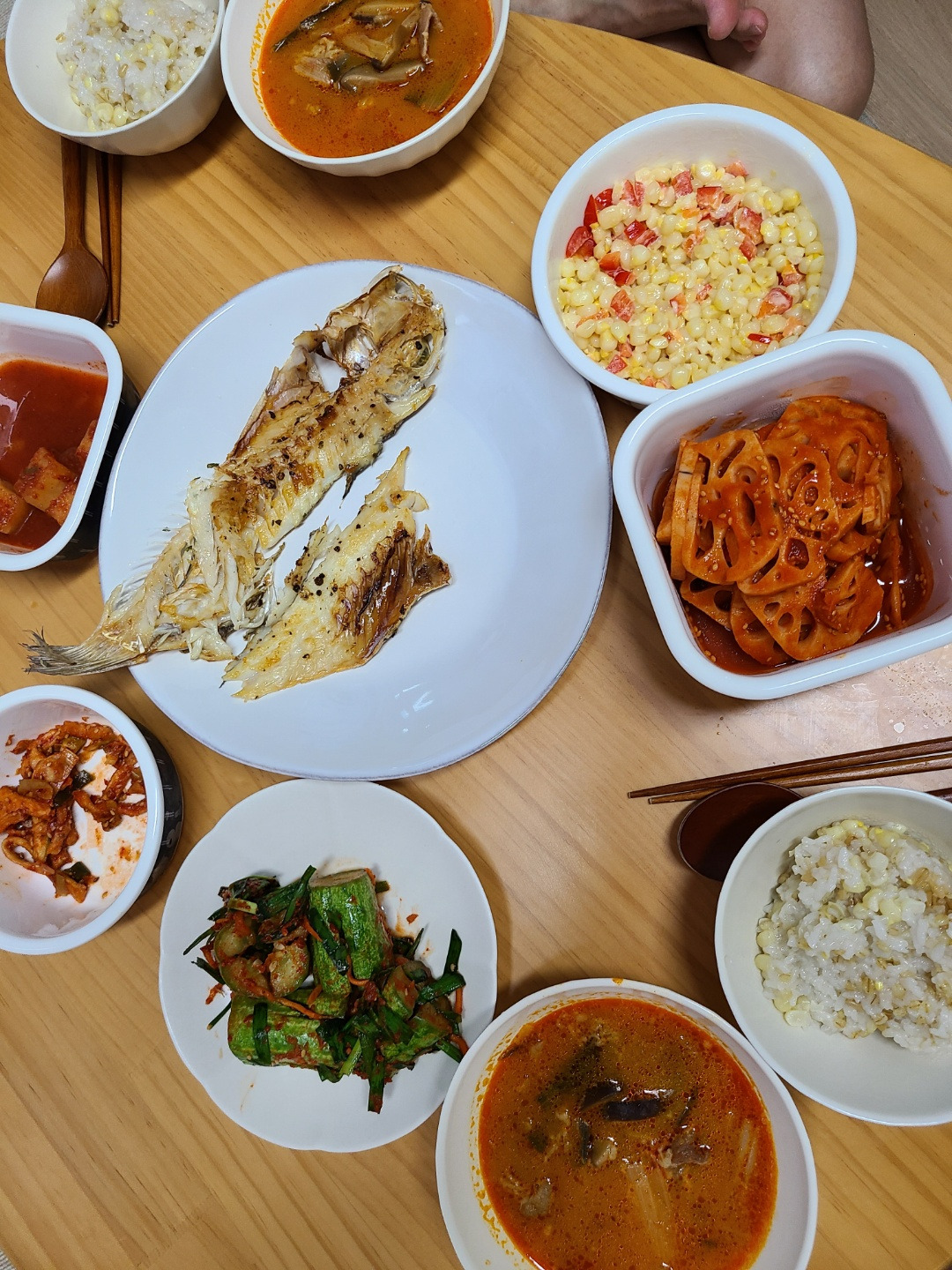 오이소박이, 연근무침, 콘버터 등등 반찬을 꺼내 두고, 옥돔 나머지 한 마리 구워서 저녁.