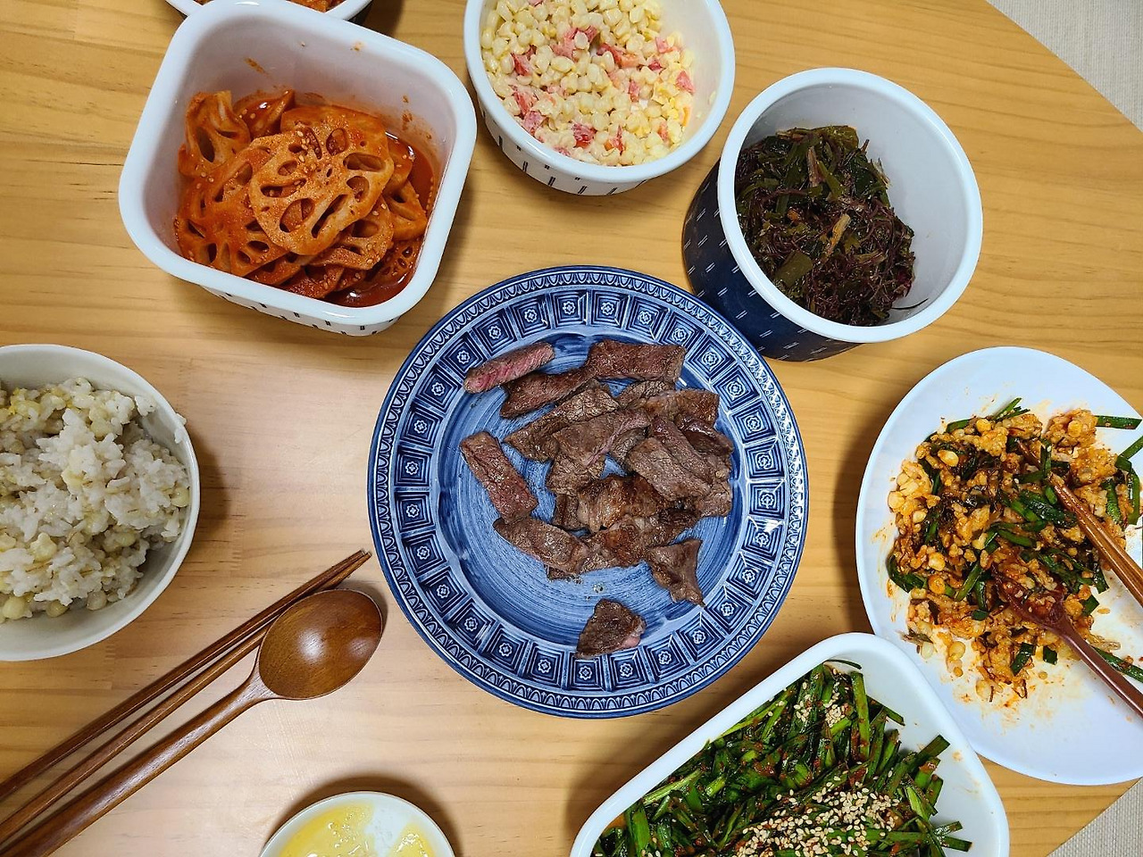 J가 받은 생일선물 소고기 구워서 저녁, 나는 해초샐러드와 부추무침을 고추장에 비벼 먹었는데 꿀맛이었다.