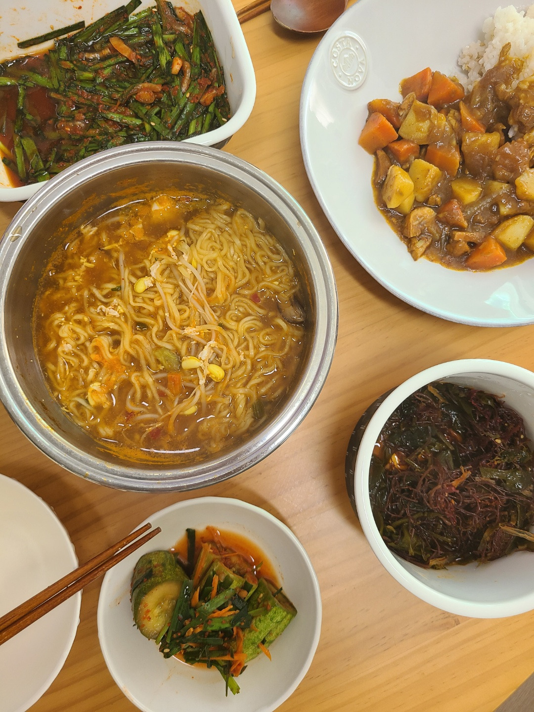 점심으로는 입 안에 염증이 생긴 J는 카레라이스, 나는 신라면 건면에 콩나물 넣어서.