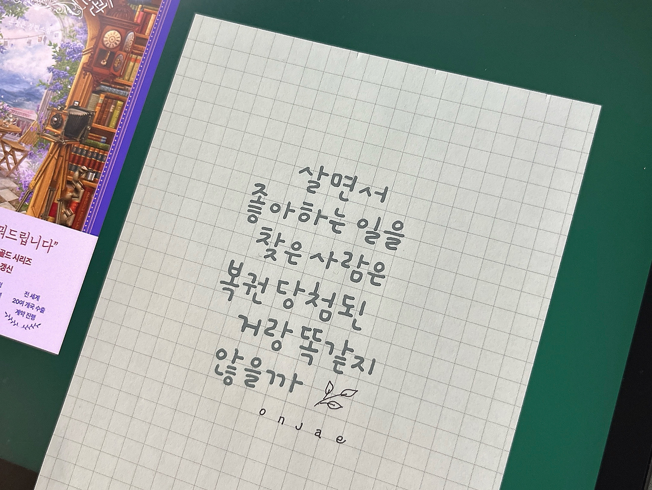 멋지게 정리한 꿈에 하나 더 추가된 글쓰기. 타인의 글을 옮겨 적는 일도 너무 행복하고 위로받는 일이지만 언제부터인가 나의 언어로 위로를 전하고 꿈을 꾸기 시작했다. 특별할 건 없지만 공기처럼 늘 곁에 머물며 편안함을 주는 글과 글씨를 쓰는 삶. 이미 이룬 꿈도 있고 진행 중인 꿈도 있다. 상상하는 꿈의 완성작이 얼마나 클지는 정확히 모른다. 그저 한 조각 한 조각 퍼즐을 맞춰가고 있고 그 과정에 작은 성취를 맞보며 감사한 삶을 살고 있을 뿐이다.