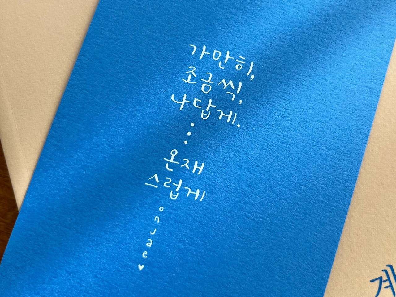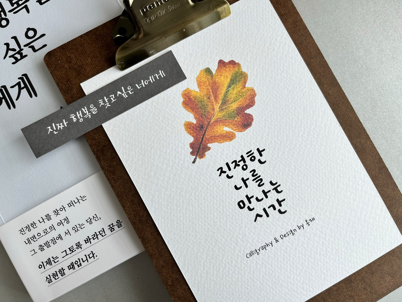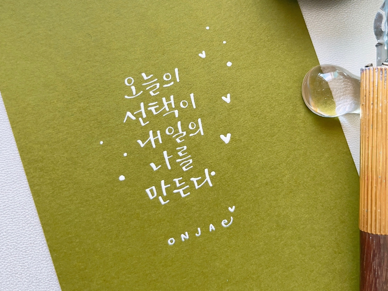 적당히 따스한 햇살이 들어오는 창가. 포근한 흔들의자에 기대 책을 보다 마음에 드는 한 구절을 만난다. 사브작 움직여 깨끗한 종이와 좋아하는 펜 한 자루 꺼내 끄적끄적 적어 책 사이에 꽂아 두고 다시 흔들의자로 가는 상상. 그렇게 나이 들어가는 것을 꿈꾸며 오늘도 입가에 미소가 걸릴 만큼 딱 그만큼의 행복을 글씨를 통해 누려본다.