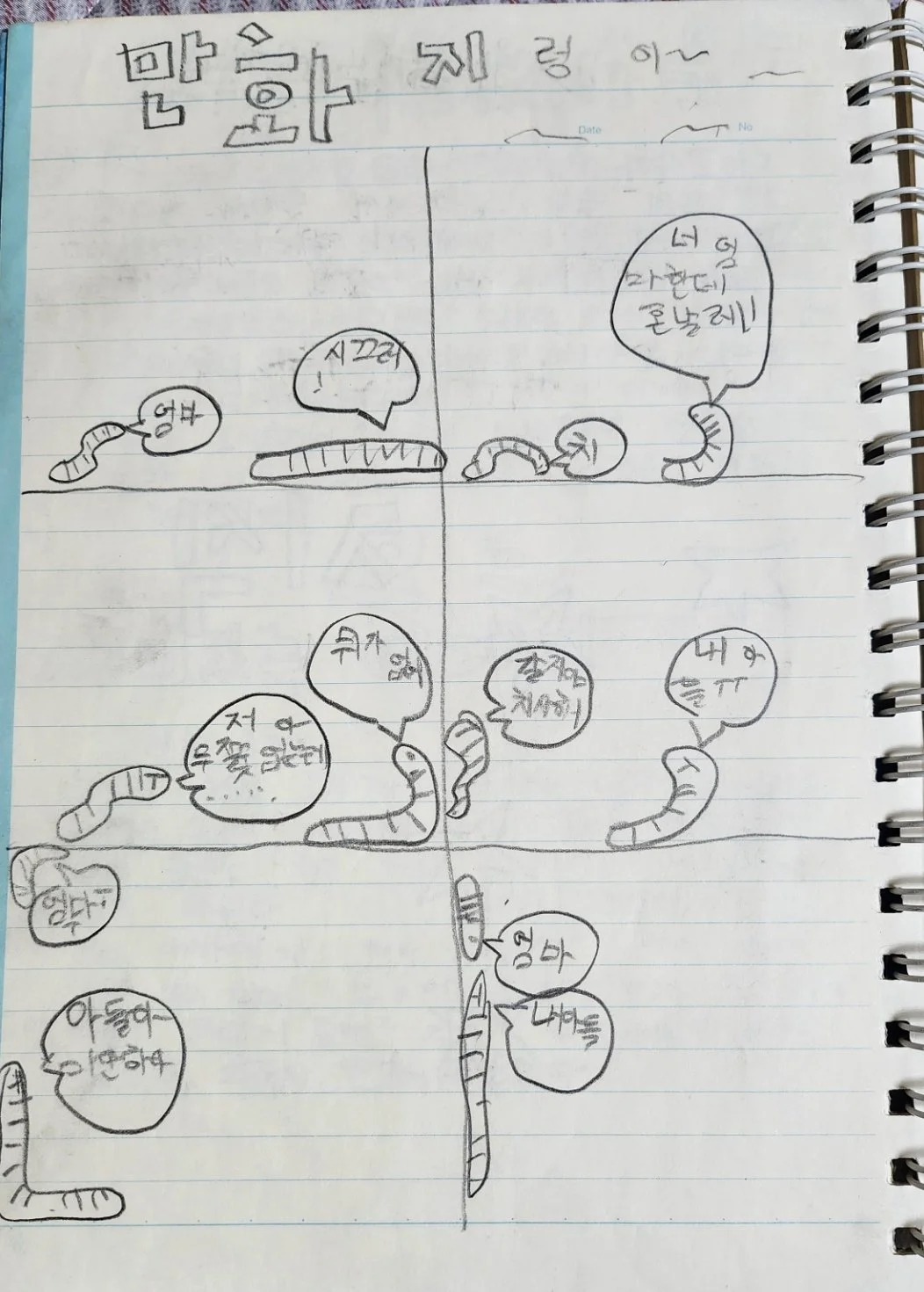 만화 속 아기 지렁이는 엄마를 찾는다.