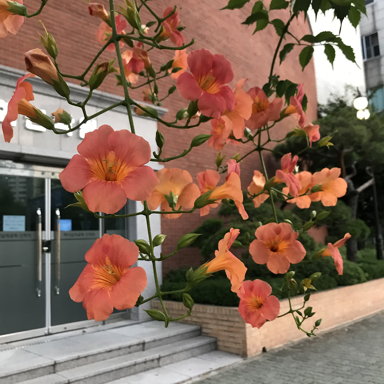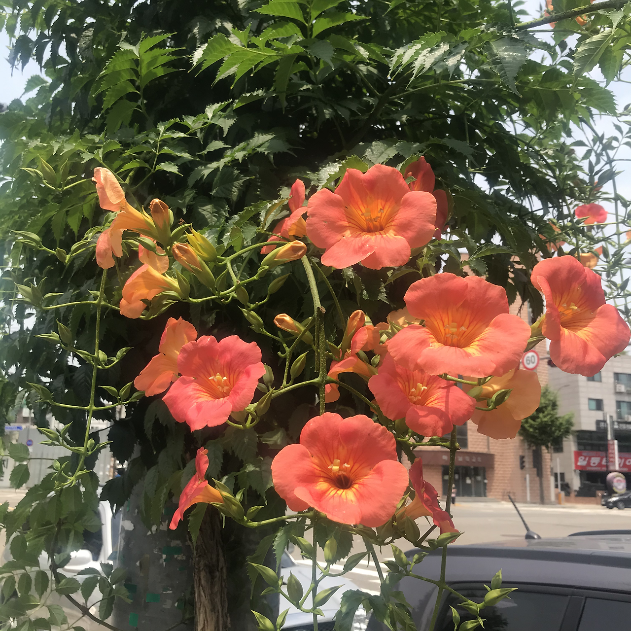 (쭉쭉 길어지고 있는 줄기와, 가느다란 줄기마다 사이좋게 넓이를 맞춰 싹을 피워가고 있는 몽우리와, 어느 순간 확 피어져서 하늘 위에서 살랑살랑 춤추는, 그러다가 휙 떨어져서 바닥에 잠시 쉬는, 때로는 너무 커서 지나가는 사람들에 발에 짓이겨 물기가 나오는 그 모든 모습의) 능소화요.