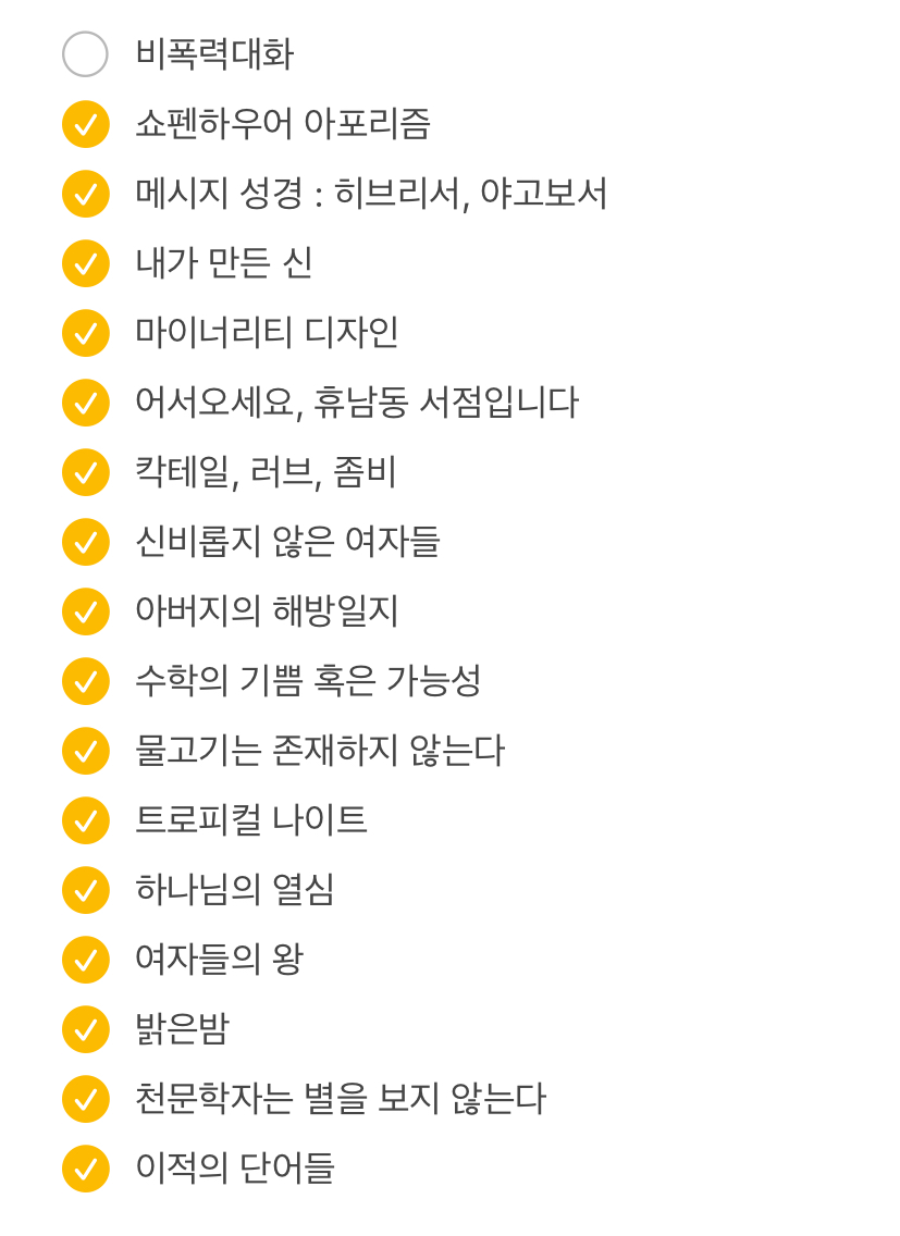 그 목표 하나는 목표 이상으로 달성을 했다. 2월부터 12월까지 11권의 책을 읽는 것이 목표였는데 총 16권을 읽었다. 사람에 따라서는 그렇게 책 좋아한다 하면서 그것밖에 못 읽었냐 말할 수 있겠지만 중요한 것은 11권의 목표를 달성하고 그 이상을 뛰어넘었다는 사실이다. 아 그렇구나. 계획대로 안될 수도 있지만 적어도 낮고 단단한 계획의 테두리를 둘러두면 그것이 삶의 기준이 될 수 있겠구나 하는 사실. 계획이 있으면 적어도 그 계획 가까이 가기 위해 노력이라도 하게 되고 운이 좋으면 달성할 수도 있다는 작은 희망을 발견했다. 아 이래서 사람들이 계획을 세우는구나. 아 내가 조금 더 많은 계획을 세웠다면 그 계획에 100% 달성하진 못하더라도 60-70%는 시도하지 않았을까. 아무것도 세우지 않았을 때는 절반도 행동하지 못하는 것이 피곤에 쩌든 직장인의 삶이라는 것을 다시 한번 느끼게 됐다. 아 나는 계획이 필요한 인간이다.
