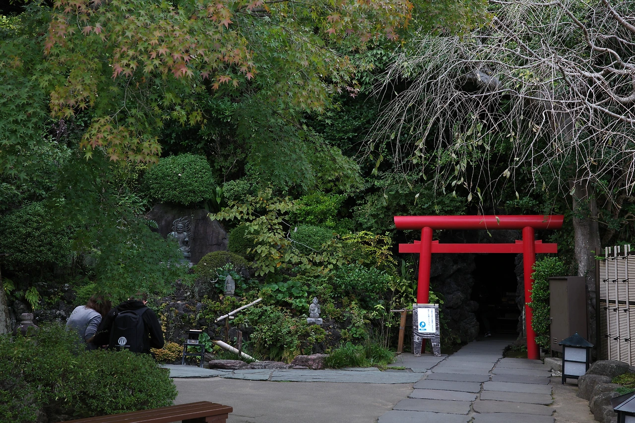 작은 정원이 하나 있고, 그걸 지나면 구석에 자리 잡고 있는 작은 도리이(붉은 문)가 보인다. 신사로 통하는 문과 상징물로써 안쪽에 있는 신성한 장소(신역)와 사람들이 사는 바깥쪽 장소(속세간)의 경계를 나타내고 있다는데, 부정한 것이 들어가지 않도록 하는 결계로서의 역할도 있다고. 안에 들어가 보면 동굴 속에 작은 불상들이 많이 놓여있으나 볼 것은 별로 없는 편이다.