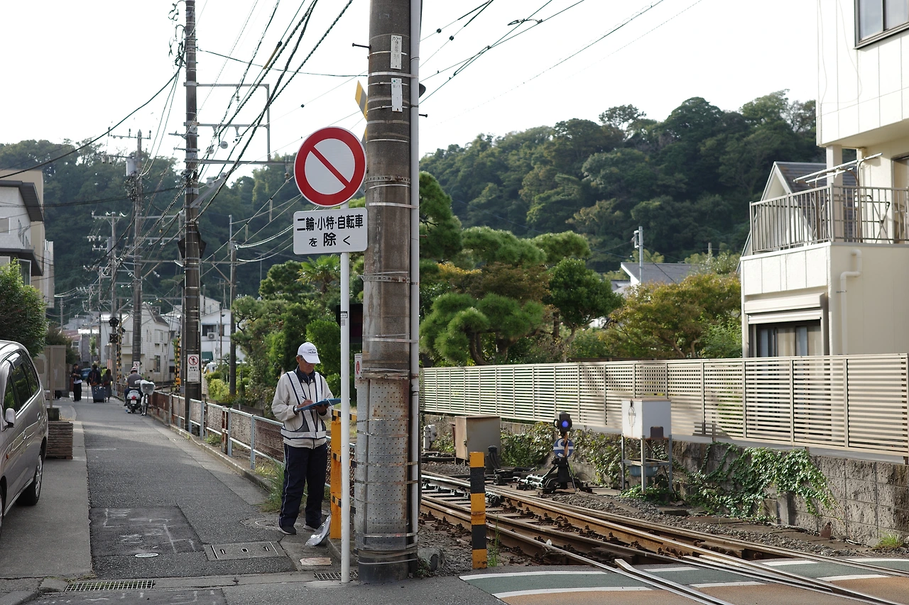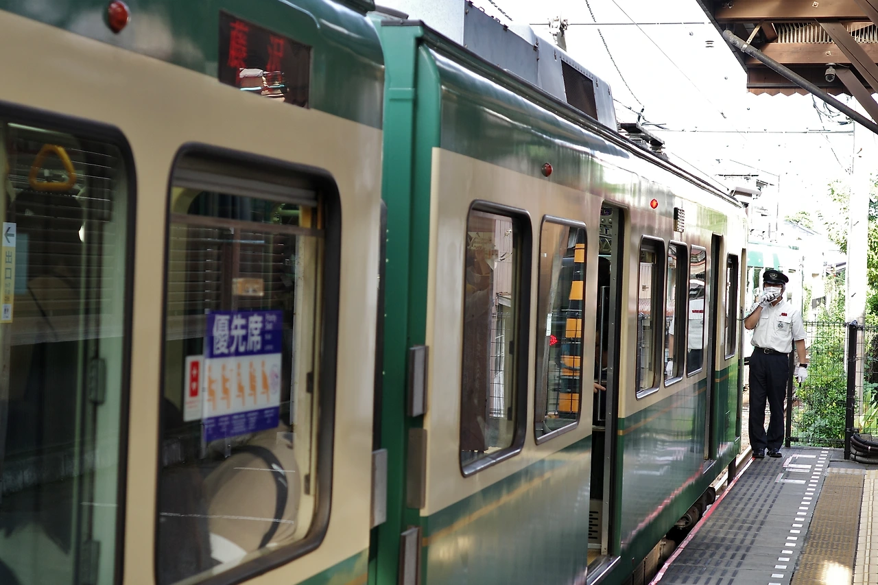 십여분이 지나고 도착한 작은 에노덴 전철. 초록과 베이지의 색 조합이 특징인데, 기관사께서 직접 나와 승객들의 탑승 여부 등을 확인하는 모습이다.