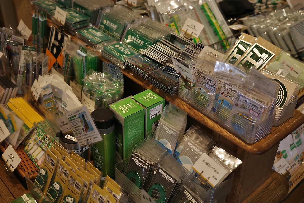다음 에노덴이 올 시간이 꽤 길기에 짬을 내 기념품샵도 들른다. 특히 오른쪽 사진의 커다란 에노덴 마그넷의 경우 두터운 철판으로 만들어져 있어 정말 탐났는데, 이때만 하더라도 에노덴의 특별함에 대해 별반 공감하고 있지 못했던 터라 패스했다(여행이 끝난 지금은 다소, 아니 굉장히 후회한다).