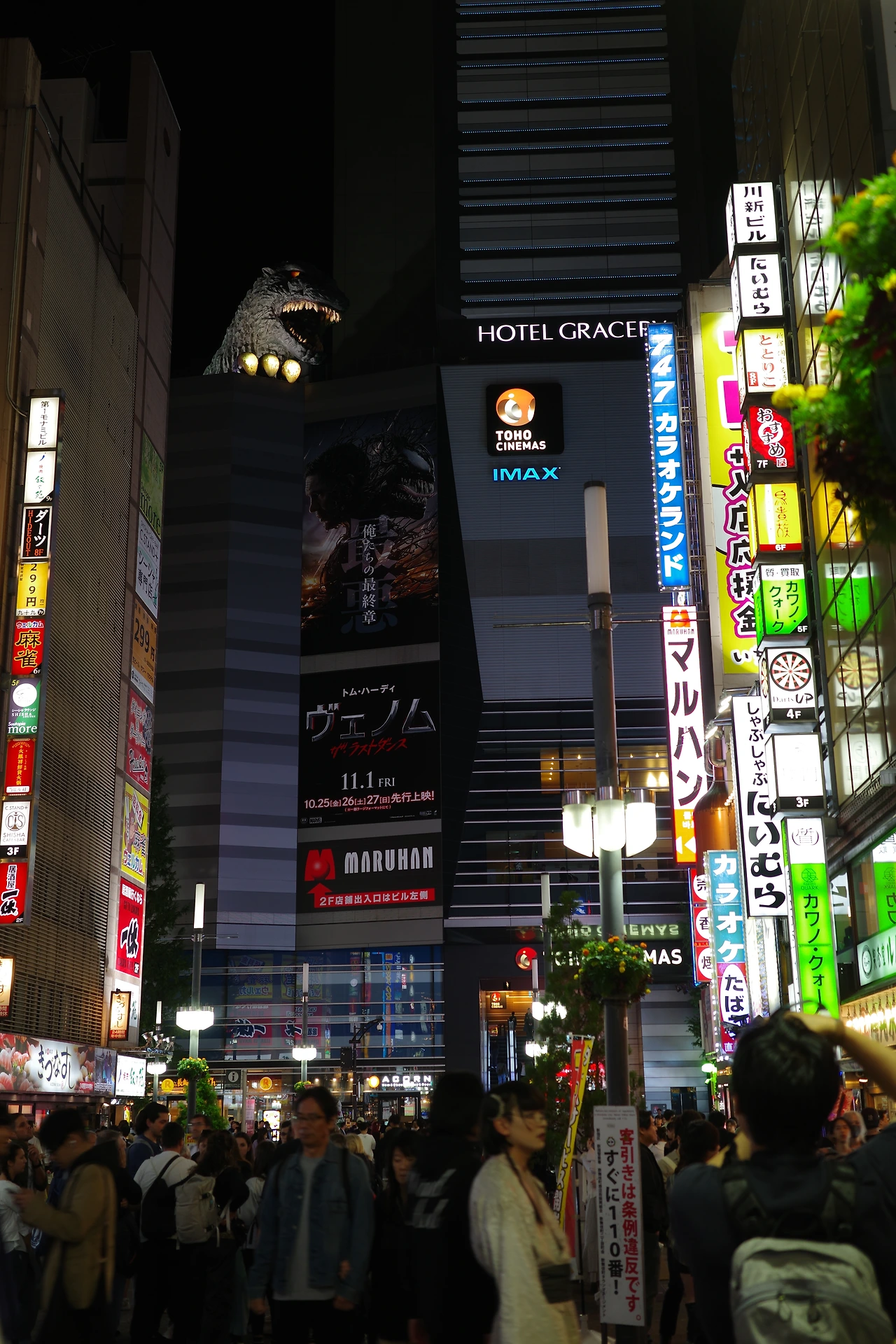 도착한 토호시네마 신주쿠. 저 위에 있는 고질라가 보이시는지? 이미 아는 분들은 다 알고 계실 신주쿠의 명물 중 하나다(올 때 또 다른 명물, 3D 고양이 간판도 봤는데 감흥은 크게 없었다).