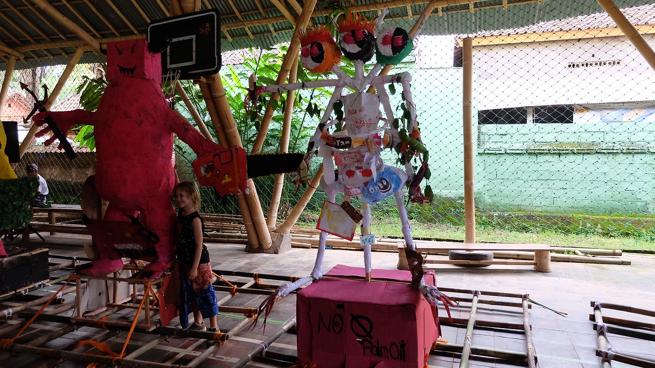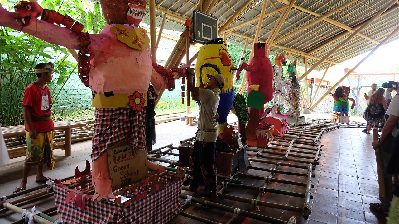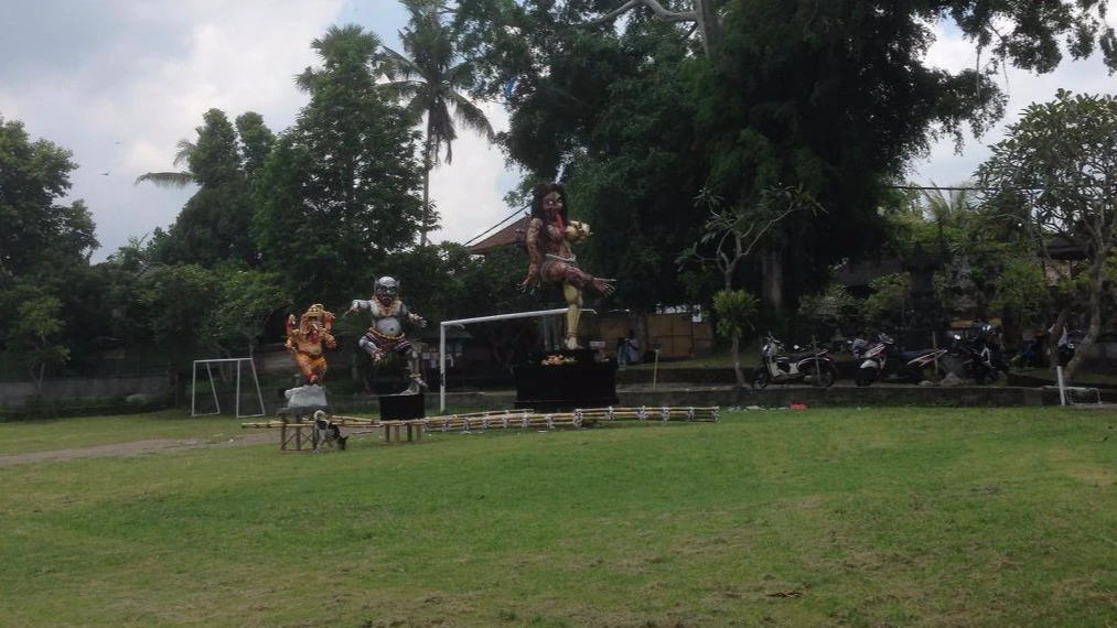 학교도 명절 준비로 부산하다. 오늘은 수업이 없고 학급별로 만든 오고오고Ogoh Ogoh 퍼레이드를 한다. 오고오고는 악령을 상징하는 커다란 인형이다. 녜삐데이 전날 밤에는 동네별로 만든 오고오고를 들고 나와 행진을 하고 의식을 치른다. 의식이 끝나면 오고오고를 태워 없앤다. 이 의식은 발리에서 볼수 있는 힌두교 문화의 하이라이트라고 할 수 있다. 오고오고를 얼마나 크고 무섭게 만들었는지 동네별로 은근히 경쟁이 이루어지기도 한다.