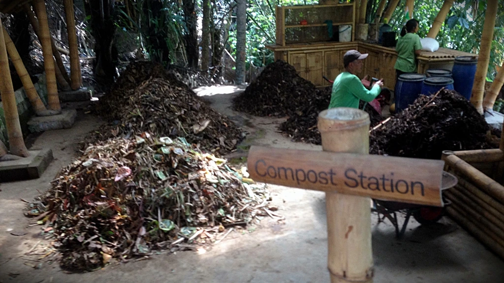 앞서 두 번에 걸쳐 학교를 둘러보았지만, 여전히 학교에는 새로운 것 투성이었다. 최신 시설의 새 병원을 보유하고 있는 베가완 파운데이션Begawan Foundation이라는 조류 센터를 지나 중학교 교실과 의사 한 분과 간호사 두 분이 상주하고 있는 학교 의료실을 둘러보았다. 학교의 메인 건물과 교실들이 모여 있는 곳을 지나서 뒤쪽의 숲길을 따라 들어가니 커다란 지붕 아래 퇴비가 쌓여 있는 것이 보였다. 학교에서 나온 음식물쓰레기와 과일 껍질, 대나무 접시에 깔았던 바나나 잎 등이 모이는 곳이다. 미생물을 활용한 숙성 작업을 거쳐 퇴비가 되면 학교 곳곳의 텃밭으로 되돌아간다.