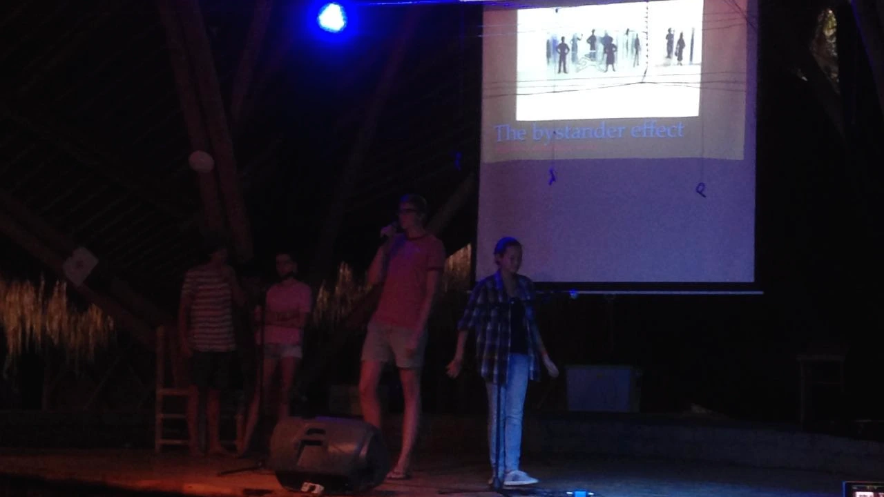 다음 순서로 선생님들이 무대로 올라왔다. 선생님들은 현란한 댄스와 립싱크로 히어로 송 메들리Hero Songs Medley를 펼쳐 강당을 열광의 도가니로 몰아넣었고, 이어진 미들스쿨 학생들의 "My hero is a river."라는 시 낭송은 감동 그 자체였다. 마지막으로 고등학교에서는 짐바도 교수와의 대담 외에 두 팀이 더 나와서, 사회심리학(Social Psychology)과 방관자 효과(Bystander Effect)를 주제로 재미있는 프레젠테이션을 선보였다.