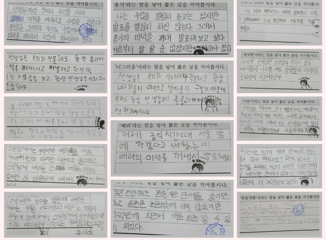 저희 반에 들어와 수업하던 보건선생님도 "이 반은 다르네요. 저는 모든 반을 들어가잖아요. 진짜 달라요."라고말해주셨습니다. 물론 제가 미덕교육 연차가 적어 1년을 열정적으로 끌고가는 힘이 적어 학년 말에는 흐트러지기도 하였지만 1년동안 저희반에는 욕은 커녕 아이들이 자주 말하는 "망했다"라는 말도 들리지 않았습니다. "애들아 망했다는 미덕의 언어가 아니란다. 그럴 때는 아쉽다라고 표현하면 어떨까?"