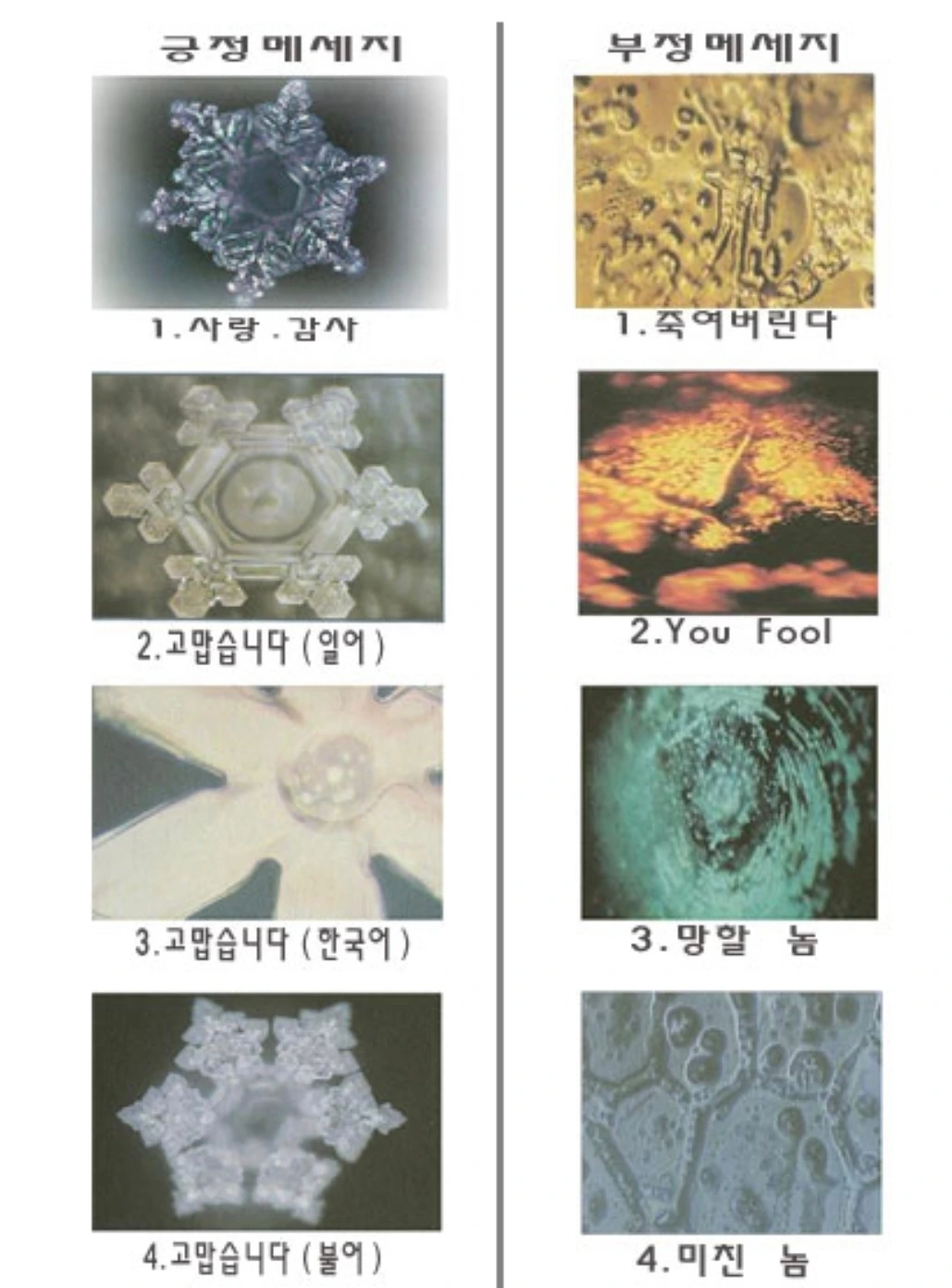 예쁘고 아름다운 말을 들은 물과 잔인하고 나쁜 말을 들은 물은 확대한 모양이 너무나 달랐습니다.