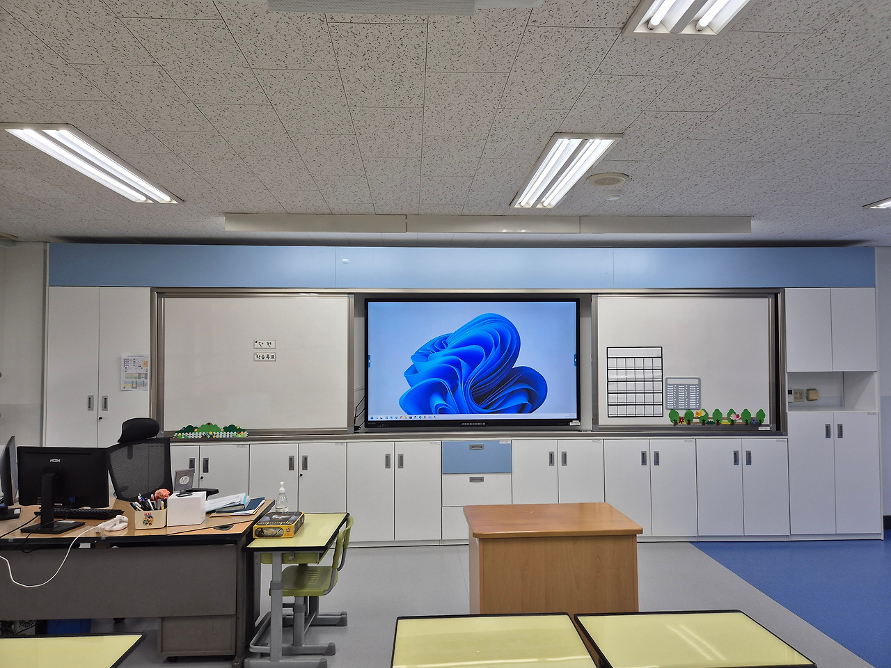 그렇습니다. 실제 집은 30년 된 구축에 살고 있지만 새로운 교실은 이렇게 최첨단 전자칠판에, 수납장은 짐을 넣고도 남습니다.