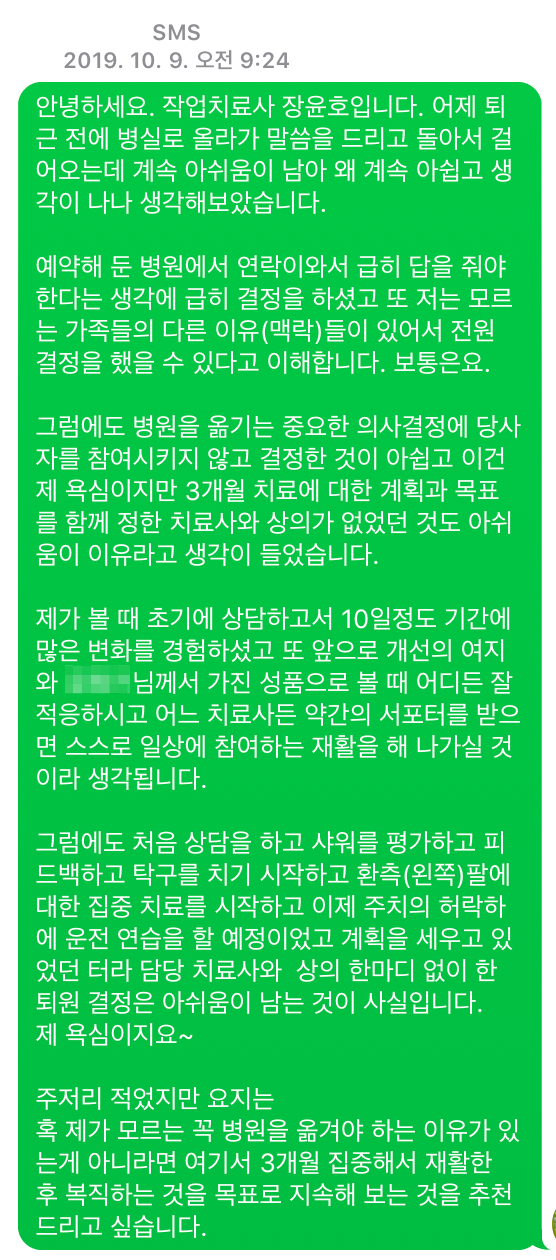 "보통 이렇게 통보를 받으면 치료사 입장에서 뭐라 할 수도 없고 그냥 보낼 드릴 수밖에 없는데요. 아쉬운 점이 뭐냐면 병원을 옮기는 부분에 대해서 치료의 주 대상자인 재활님과 상의를 하지 않았다는 점이 가장 아쉽다는 거예요. "