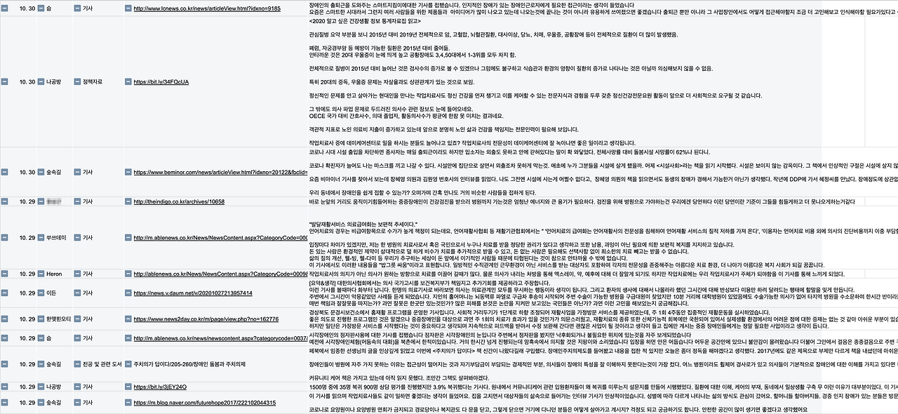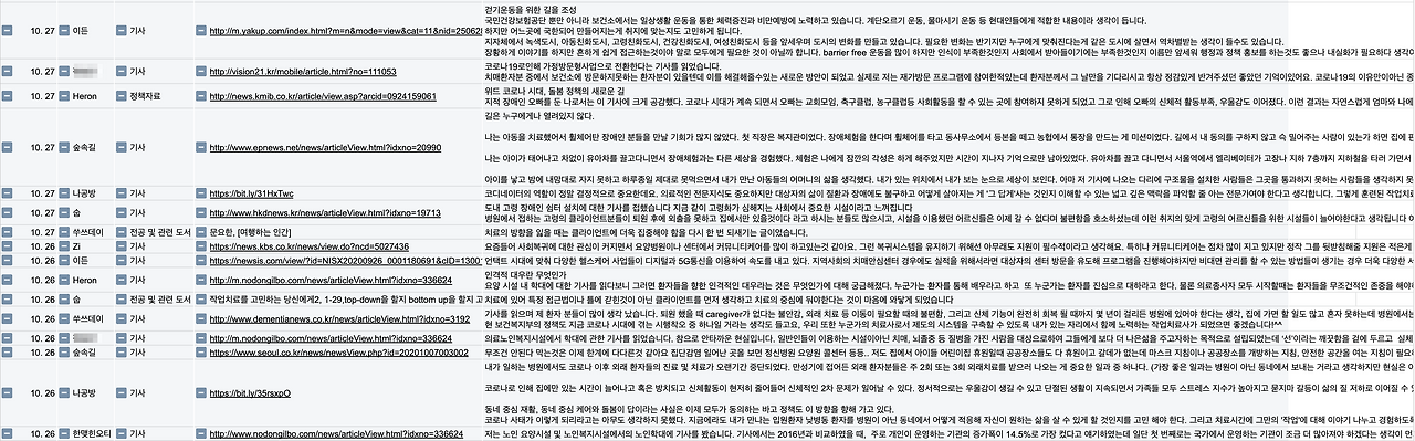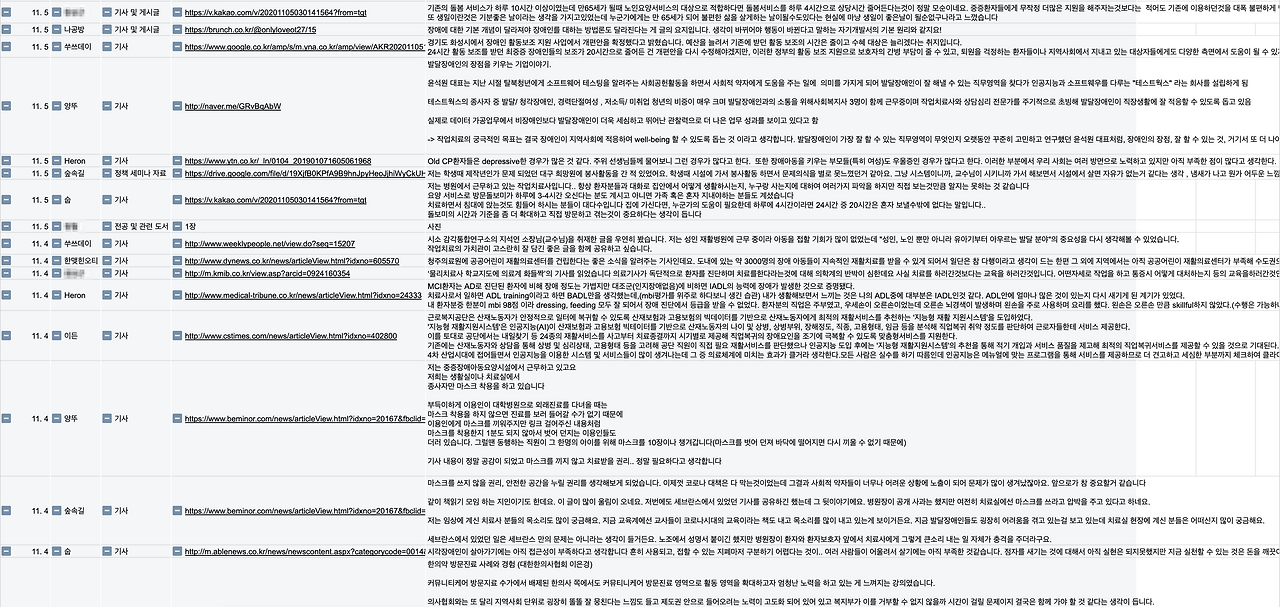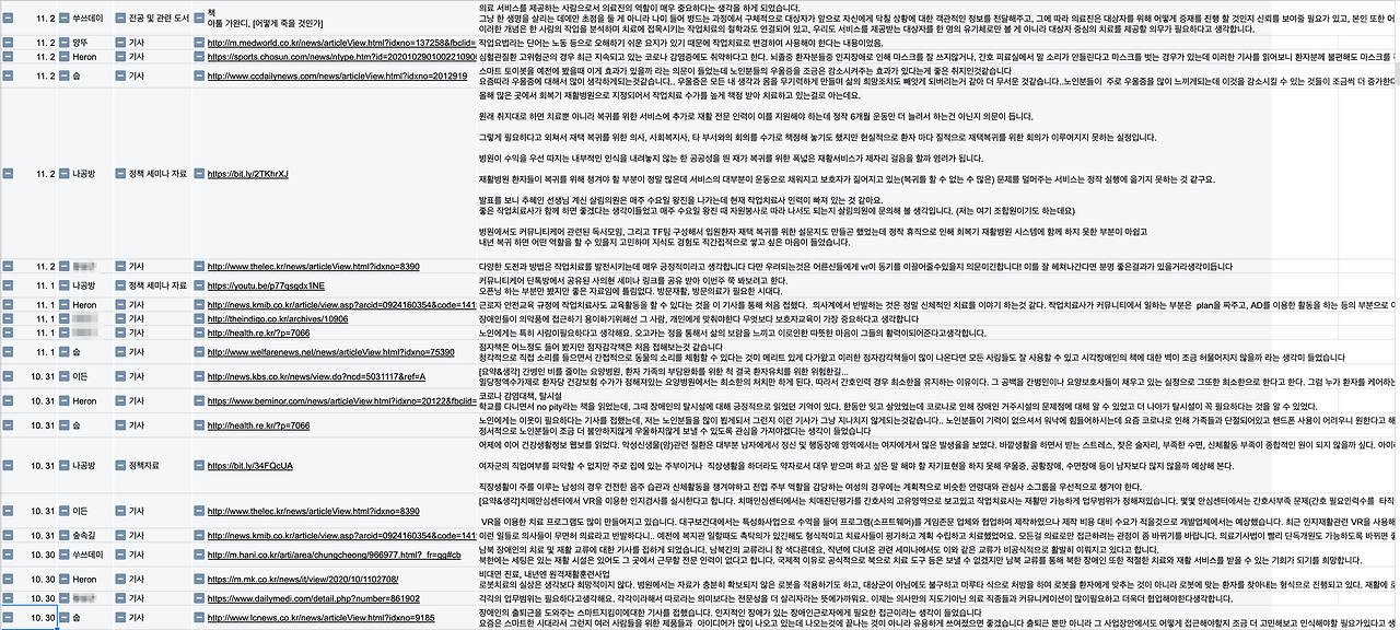 대한작업치료사협회 정책부회장님께서 매주 페이스북에 올려주신 작업치료 뉴스 클리핑 링크를 기본으로 하고 개인적으로 읽은 책, 저널, 정책 및 세미나 자료집 심지어 유튜브 영상까지 자유롭게 읽고 본다. 그런 다음 자신만의 시각으로 짧게 생각을 적어 단톡 방에 인증한다(그런데 다들 길게 써서 나도 길게 쓰게 됐다). 단톡 방에 공유한 글에 댓글을 다는 형태로 연결된 생각이 공유된다.