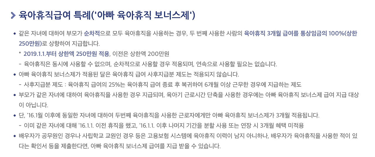 그런데 육아휴직 시작 3개월 상한선 250만원을 받는다는 이야기는 엄마 또는 아빠가 두 번째 육아휴직일 때 3개월이었던 것이다. 아래와 같이 명시되어 있었다.