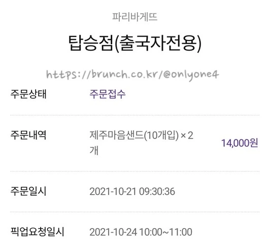 이번엔 탑승점(출국자 전용)에서 24일 일요일 마지막 날 수령할 제주 마음 샌드이다.