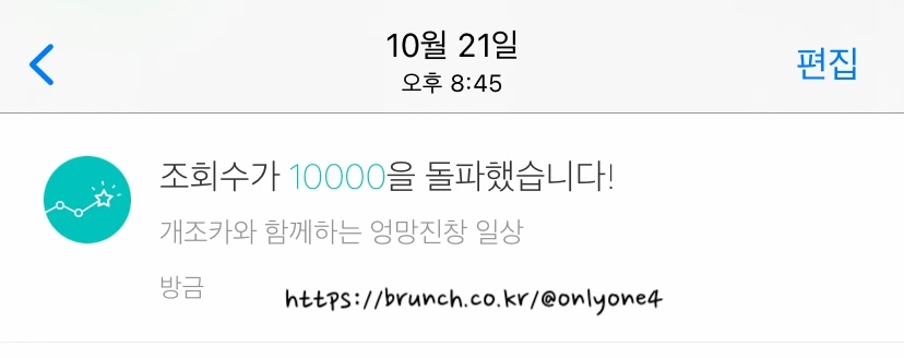 "여러분! 저 브런치에 글 올리는데 조회수가 막 10,000명이 넘었다는 알람이 울렸어요!! 박수한 번 주세요!"