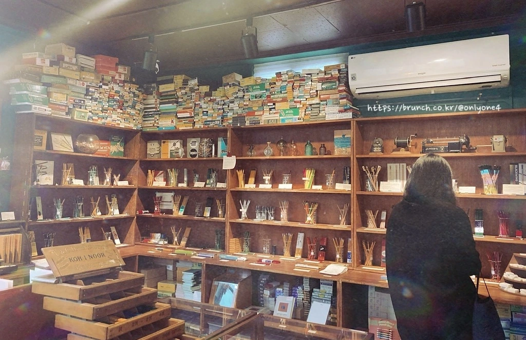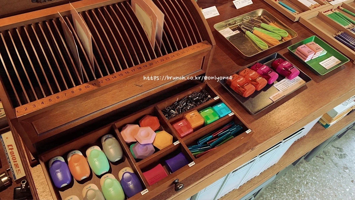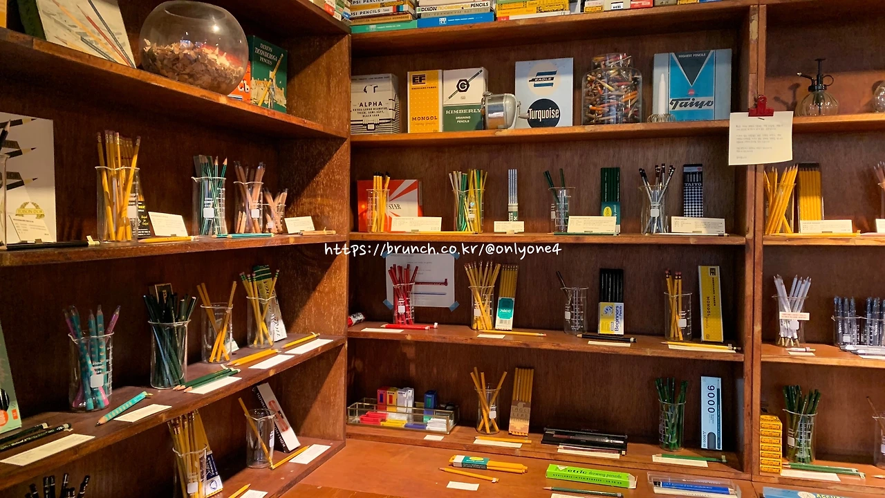 아무래도, 공간이 주는 따스함때문인 것 같다. 인터넷으로 주문을 할 수도 있고, 연필을 파는 다른 매장도 많이 있지만 적황과 감색 그 언저리 톤의 가구들이 옛날 우리네가 다녔던 초등학교의 향수를 떠올리게 한다.