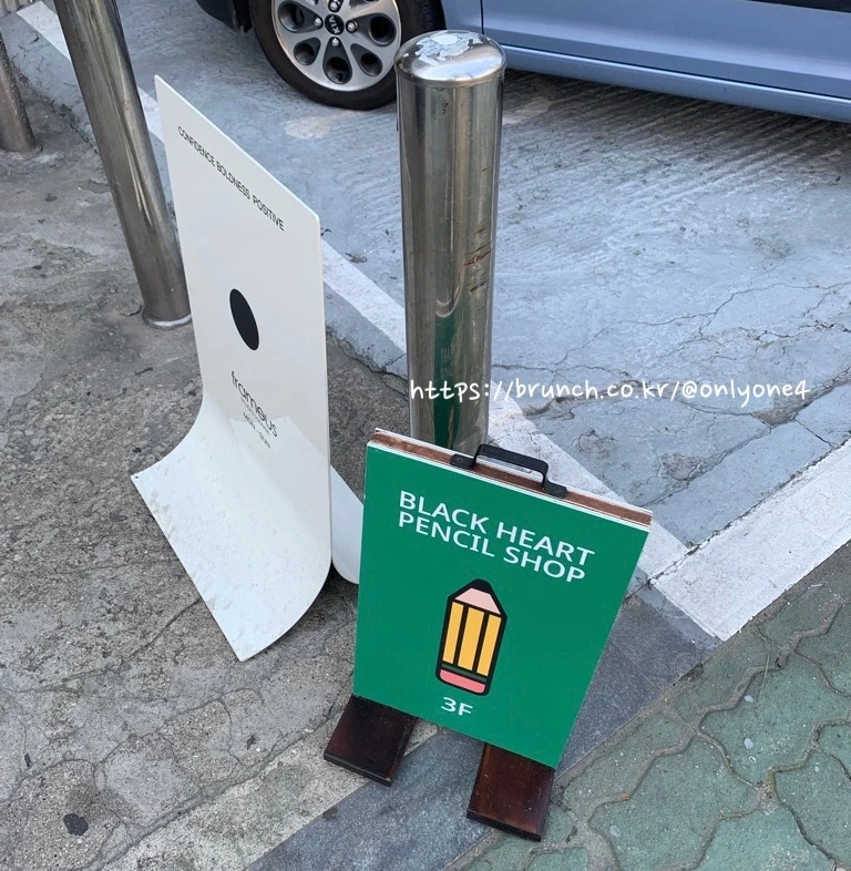 지도를 보며 걸어도 가게를 한 번에 알아보기는 힘들다. 그도 그럴 것이 대부분의 편집샵이나 문구점이 1층에 있는 것에 비해 '흑심'은 1층이 아닌 3층에 위치해 있고 건물의 외벽에도 누구나 쉽게 알아볼 수 있는 커다란 간판이 있는 것이 아니기 때문에, 처음 온 방문객은 예상치 못한 정비소 간판에 당황하기 십상이다.
