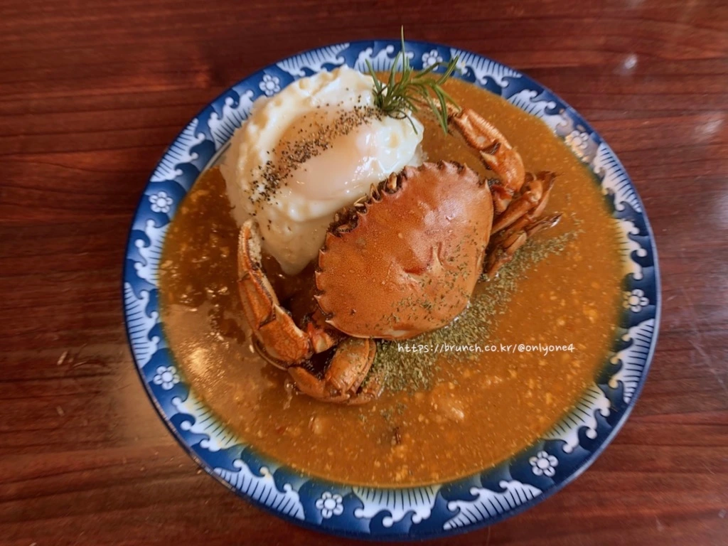 문쏘의 주력상품은 매콤한 카레 위에 황게가 큼직하게 올라가 있는 '황게 카레'인데, 제주도에 와서 무슨 카레를 먹냐 싶겠지만 워낙 게를 좋아하기도 하고, 그래도 게 한 마리는 먹어줘야 제주도에 온 기분이 나기 때문에 이 메뉴를 선택했다.