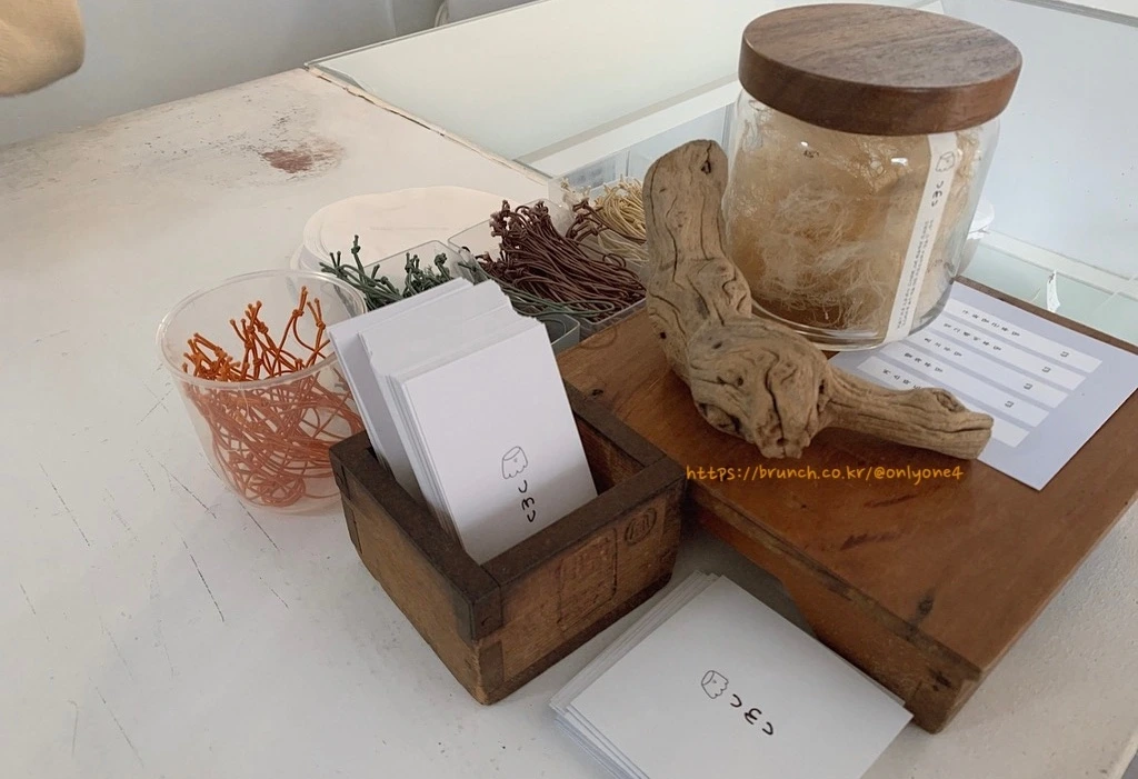 우무는 직접 금형 제작할 만큼 포장 용기에 진심인 편인데, 포장 끈마저도 다시 사용할 수 있게 신경을 썼다고 한다. 메뉴에 따라 깔맞춤 한 색색깔의 포장끈을 머리 묶을 때 사용해도 좋지만 개인적으로는 요일별로 영수증을 정리할 때나 폴라로이드 필름을 날짜별로 정리할 때 요긴하게 사용하였다.
