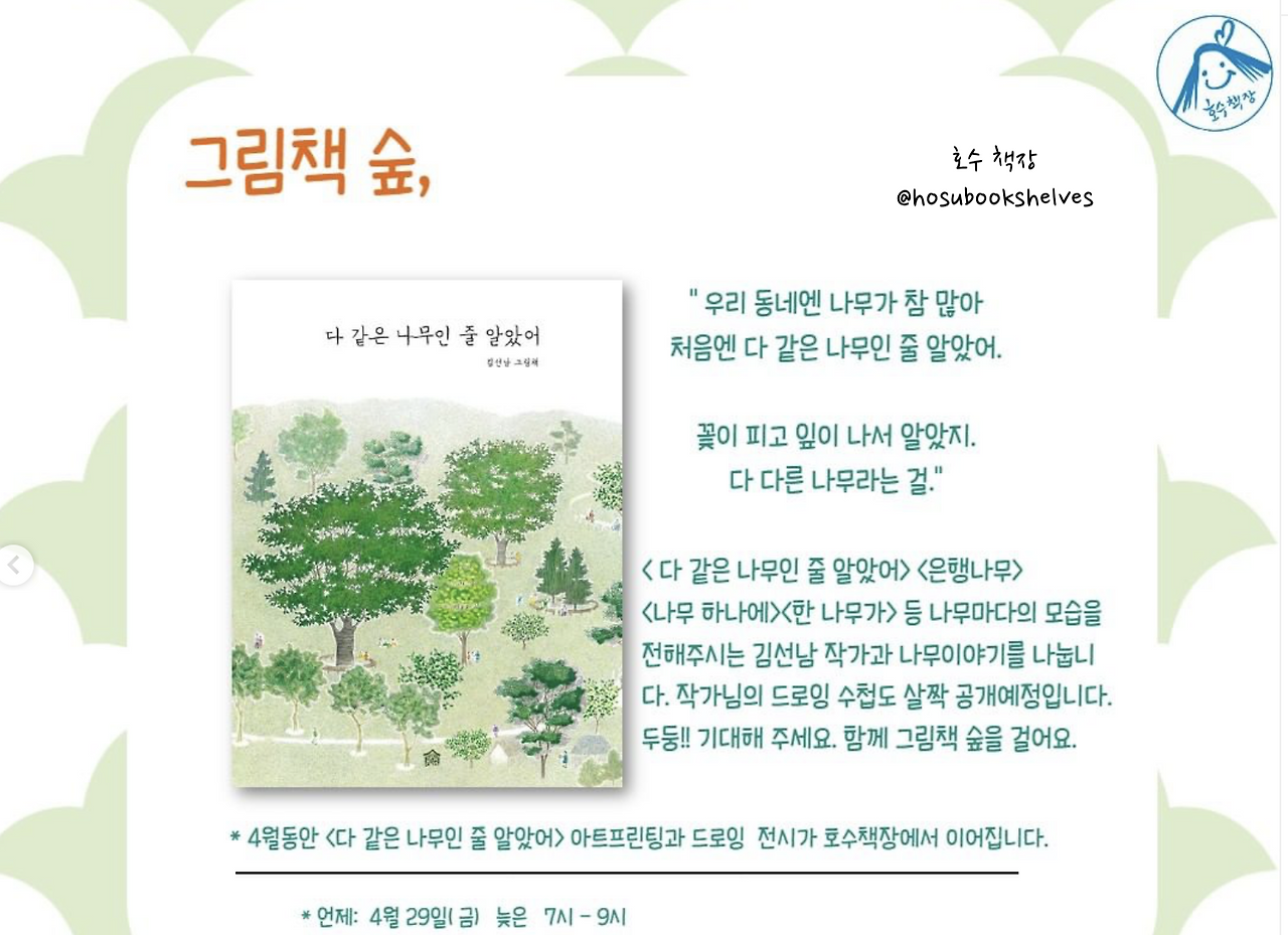 생태 서점 호수 책장(@hosubookshelves)에 김선남 작가님 강연 안내 피드가 떴다.