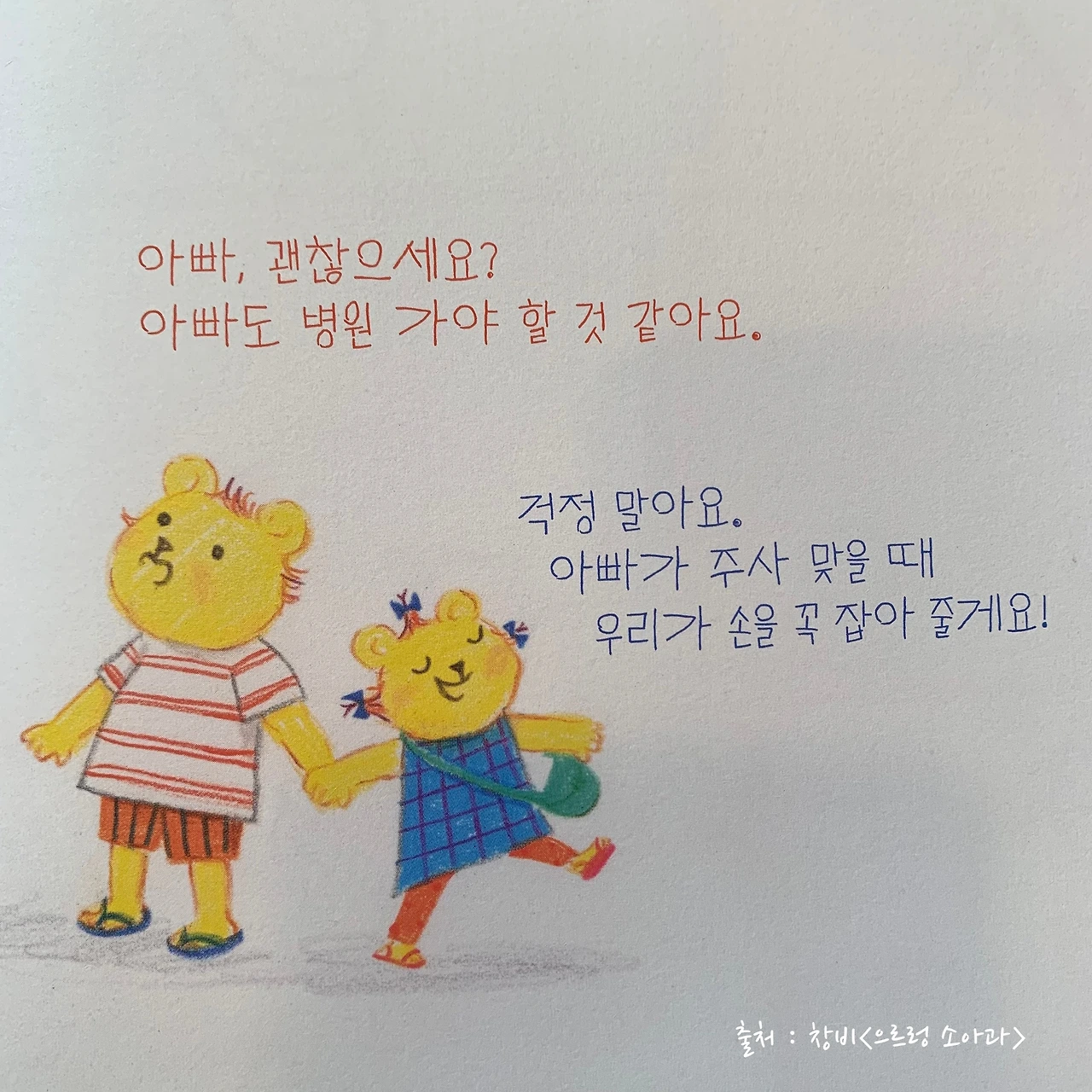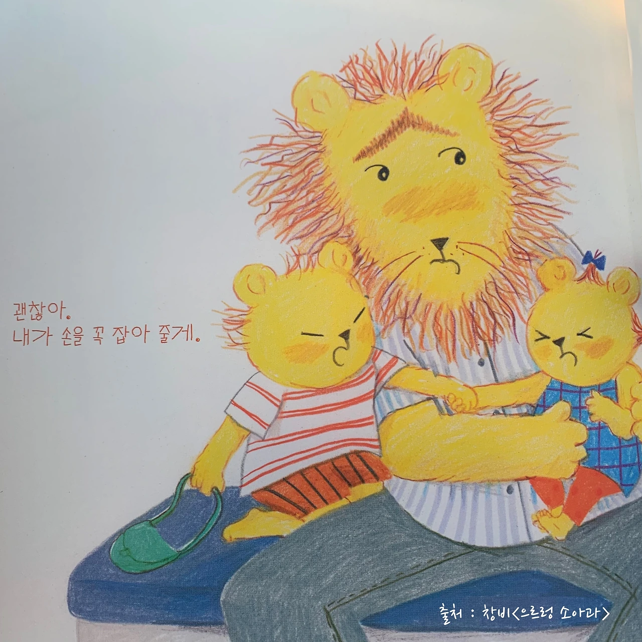 책을 읽으며 나의 어린 시절이 떠올랐다. 나는 어렸을 때부터 엄청난 울보였다. 하지만 놀랍게도(?) 주사 맞을 때만큼은 아들 사자처럼 무섭지 않은 척했던 어린아이였다. 울지 않았던 이유는 엄마나 간호사 선생님이 칭찬을 해주는 게 기분이 좋았기 때문이다. 지금 와서 생각해 보면 너무 어려서부터 그런 것을 의식하고 살았던 게 아닌가 싶은 생각이 든다. 어린이는 어린이답게 솔직하게 무서운걸 무섭다 말해도 괜찮았을 텐데 그 시절 나는 일찍부터 어른이 되고 싶었던 것 같다.